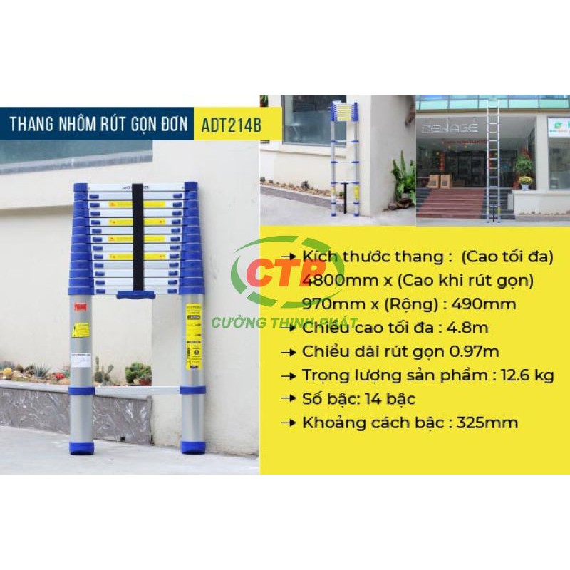 - Sản phẩm thang nhôm rút gọn ADT214B có trọng lượng khá nhẹ chỉ khoảng 12.6 kg. Điều này giúp người dùng dễ dàng mang vác, di chuyển từ nơi này sang nơi khác. Việc kéo thang lên và hạ xuống cũng rất nhẹ nhàng, người sử dụng không phải tốn quá nhiều sức