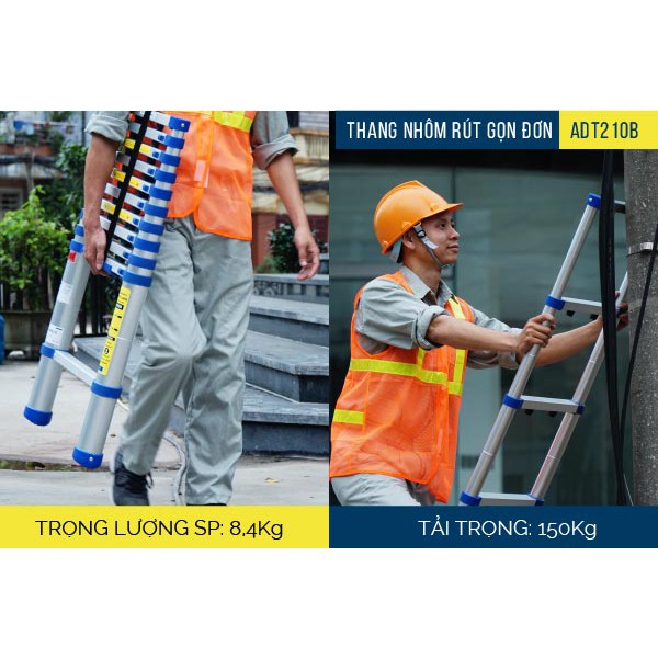 – Thang Advindeq ADT210B thuộc dòng thang nhôm rút phổ biến nhất hiện nay, khác với các dòng thang khác trên thị trường, thang nhôm ADT210B sử dụng nhôm nguyên chất không qua tái chế và không hề có sự pha tạp của các hợp chất khác gây ảnh hưởng tới chất lượng. Để sản xuất ra được chiếc thang nhôm chất lượng phải trải qua nhiều quá trình, thao tác thủ công: hàn, hàn nguội, tán đinh, ốc vít, sơn tĩnh điện, nhựa bọc chống trơn trượt,...Tất cả các quy trình đó đều được giám sát nghiêm ngặt.- Thang nhôm ADT210B có thể chịu đựng được trọng tải 150kg bằng trọng lượng của 2 người lớn. Tuổi thọ của thang nhôm cũng cao hơn rất nhiều so vơi các loại thang khác trên thị trường. Khi không sử dụng có thể rút ngắn để dễ dàng di chuyển và cất giữ mà không chiếm nhiều diện tích, kích thước khi rút ngắn còn 0,8 mét có thể để dưới gầm bàn, gầm giường, lúc vận chuyển có thể đặt lên xe gắn máy hoặc trong cốp xe hơi mà không tốn nhiều công sức.