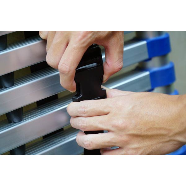 - Nhà sản xuất còn thiết kế thêm chốt chống kẹp tay cho người sử dụng, chốt này nằm phía dưới mỗi bậc thang, khi bạn rút gọn thang sẽ hạn chế việc tay bị kẹp giữa 2 bậc thang.