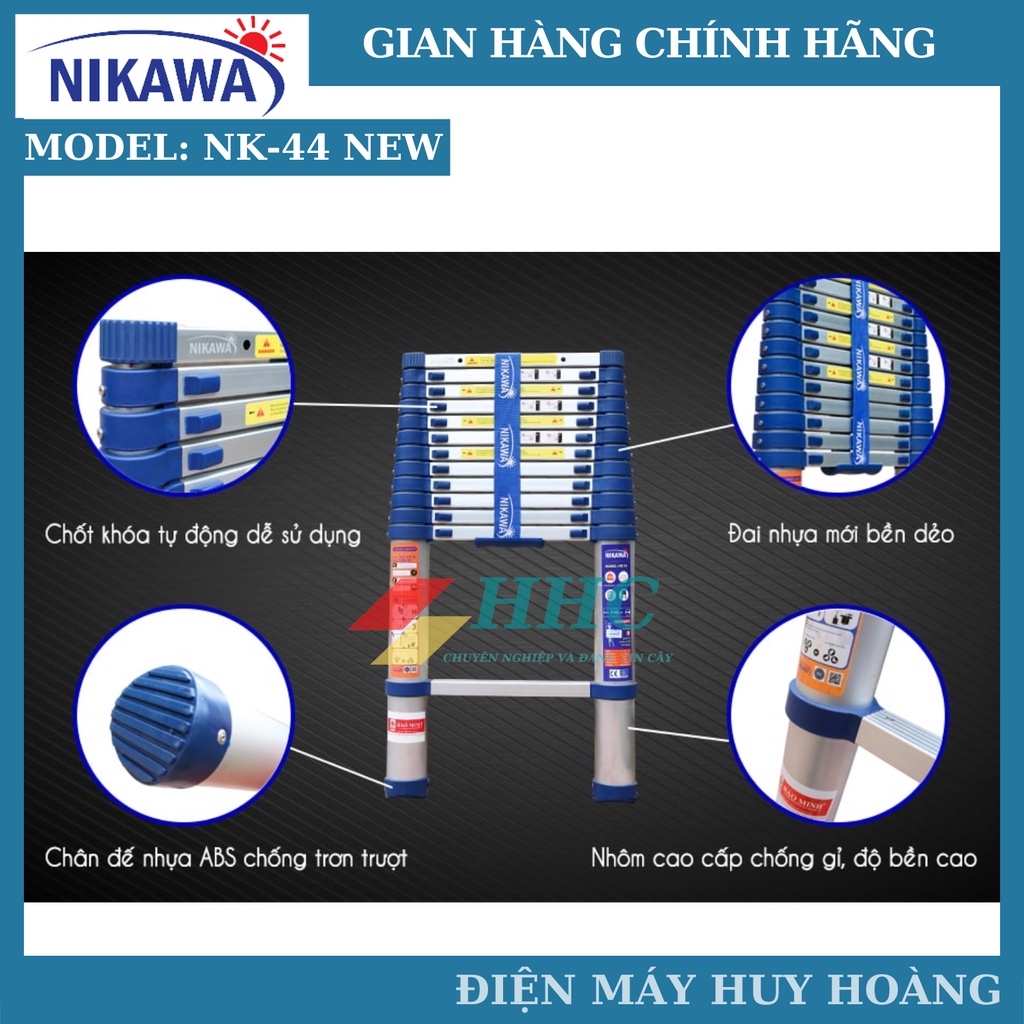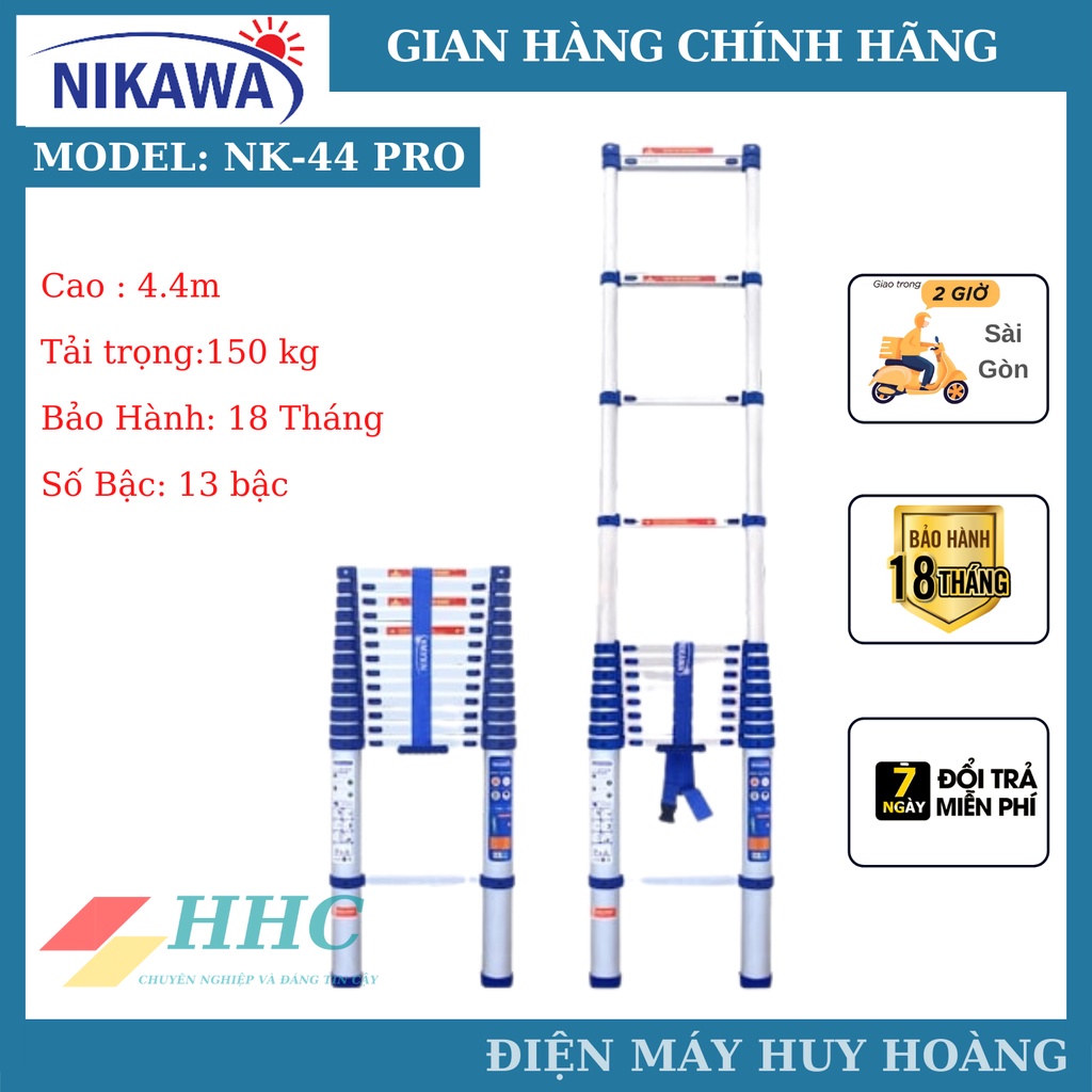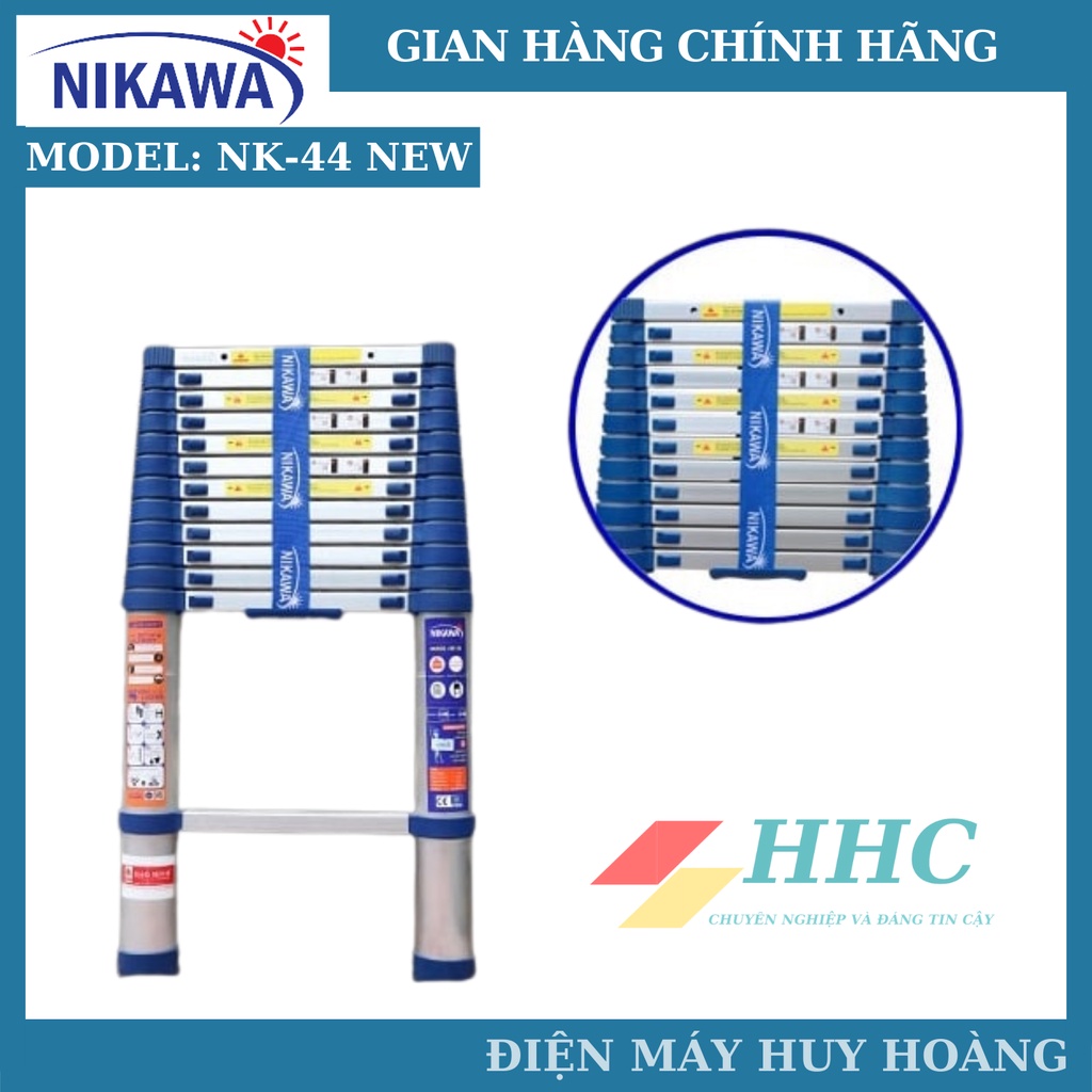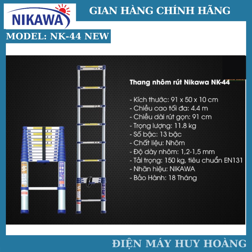 - Thang nhôm rútNK-44new và NK-44Pro được bảo hành tại trung tâm Điện Máy Huy Hoàng và các chi nhánh của tập đoàn Nikawa trên toàn quốc.
