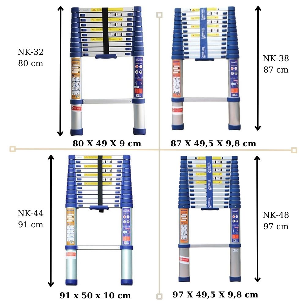 - NK-32 có 11 bậc, chiều cao tối đa chữ I là 3,2m, chiều cao rút gọn 80cm, trọng lượng thang 8,7kg
