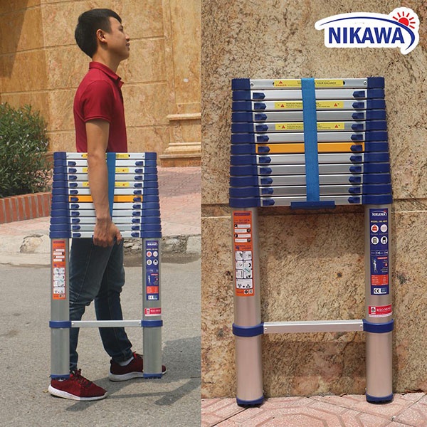 - Thang nhôm rút gọn Nikawa có thể rút gọn lại sản phẩm sau khi sử dụng, giúp tiết kiệm tối đa diện tích cất giữ, không tốn diện tích nhà, dễ dàng đặt trong xe ô tô hoặc vận chuyển bằng xe máy.