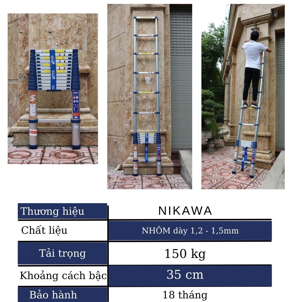Giới thiệu Thang nhôm rút xếp đơn gấp gọn 11 đến 14 bậc 3,2m đến 4,8m nhập khẩu Nhật Nikawa bảo hành 18 tháng NK MAXBUY hỏa tốc HN