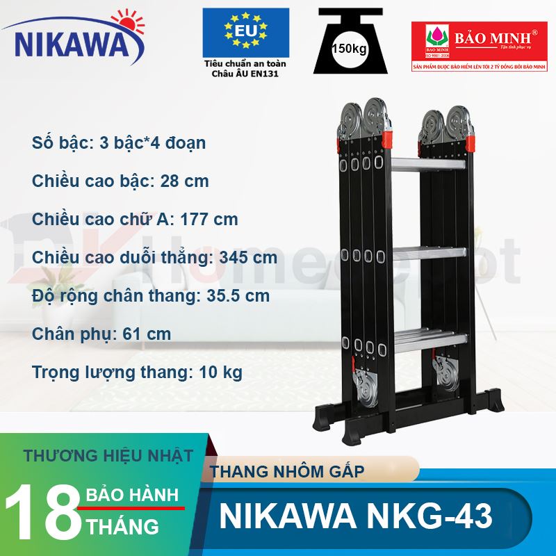 2. Thông số kỹ thuật của Thang nhôm, thang gấp đoạn Nikawa NKG-43, 3 Bậc 4 Đoạn