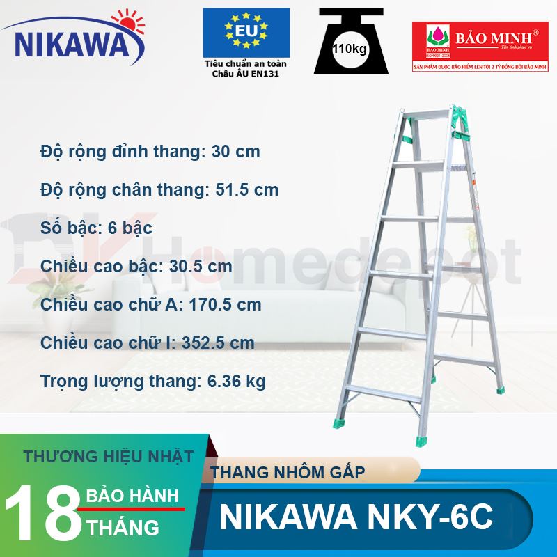 👉 Thang nhôm gấp Nikawa NKY-6C được chế tạo từ hợp kim nhôm siêu nhẹ, siêu bền, siêu chịu lực, có khả năng chịu được tải trọng lên tới 150kg.