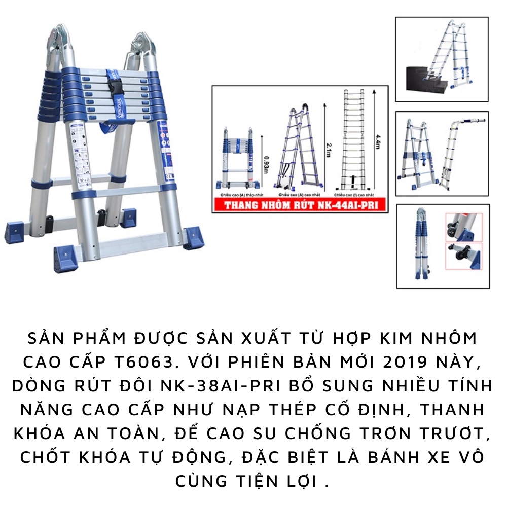 1. Thông tin sản phẩm Thang nhôm, thang rút đôi Nikawa NK-38AI-Pri 1.9m, 6 bậc– Thay vì trước đây có 1 chân phụ tháo rời được thì bây giờ có 2 chân phụ giúp tăng độ chắc chắn cân bằng hơn. Có thể tháo rời bất cứ lúc nào để phù hợp với địa hình làm việc của người sử dụng. Đồng thời phần nhựa tiếp xúc đất của chân phụ được cải tiến chất lượng tốt hơn, tăng tiết diện tiếp xúc mặt đất và tăng độ ma sát chống trượt hiệu quả hơn.