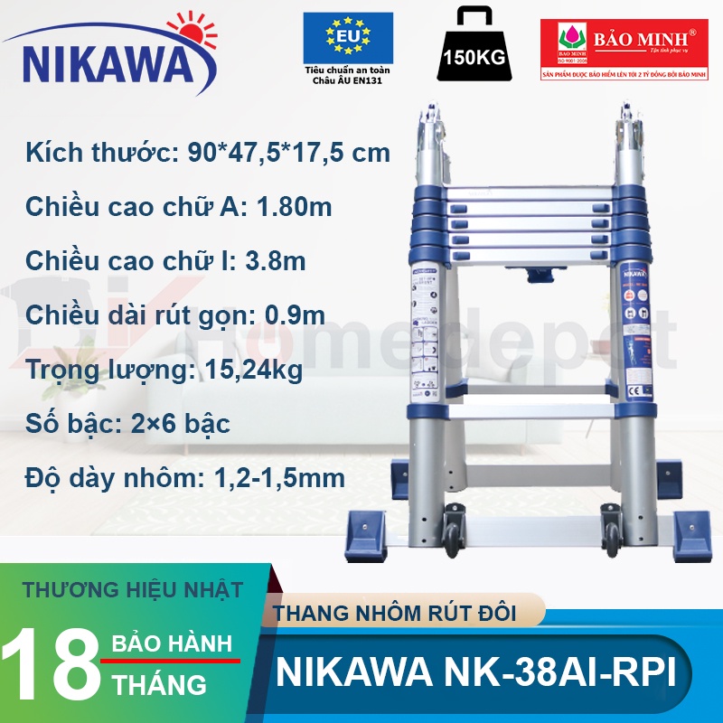 Giới thiệu Thang nhôm rút đôi chữ A Nikawa NK-38AI-Pri, chiều cao chữ A 1.9m, 6 bậc, nhập khẩu Nhật Bản, bảo hành chính hãng