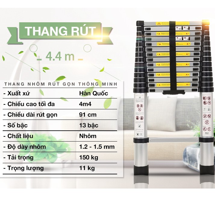 CHI TIẾT SẢN PHẨM: Chiều cao rút gọn: 0,91m Kích thước sản phẩm: 91 x 50 x 10 cm Số bậc: 13 bậc Tải trọng tối đa: 150kg Chiều cao tối đa: 4,1m Màu sắc Ống trắng + Đai nhựa đen Trọng lượng: 12,5kg Công nghệ: Nhật Bản Bảo hành: 24 tháng Thang nhôm rút 4m1 là loại thang rút thông minh chỉ sử dụng được ở dáng chữ I, với chiều cao tối đa 4m1 và khi thu gọn lại để cất giữ hay di chuyển chỉ còn 0,91m. Thang rút là sản phẩm nổi bật trên thị trường khi được sản xuất bởi vật liệu hợp kim nhôm cao cấp bền chặt, độ dày ống thang đạt 1,5mm, theo tiểu chuẩn an toàn sản xuất Châu Âu EN131. Tải trọng 150kg