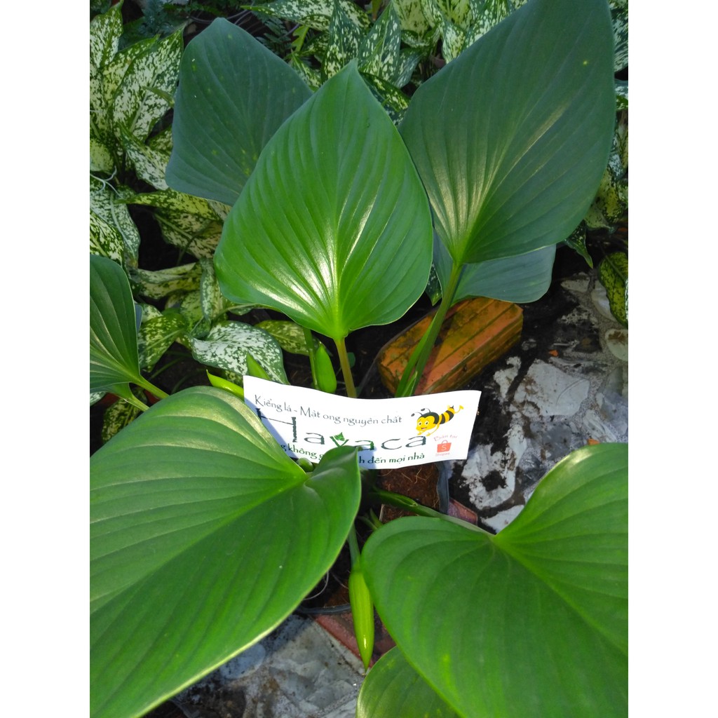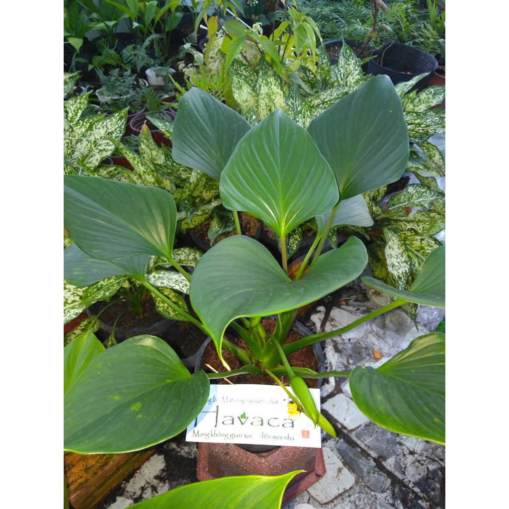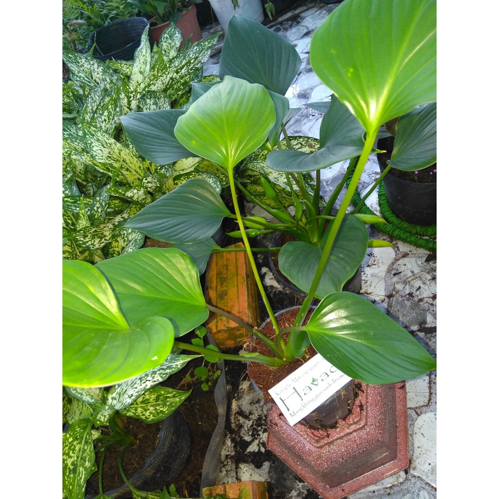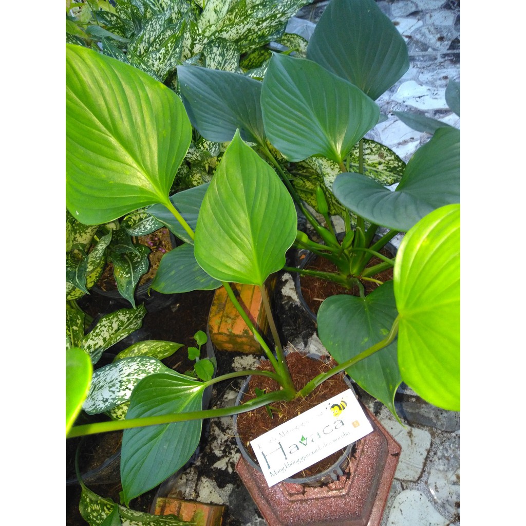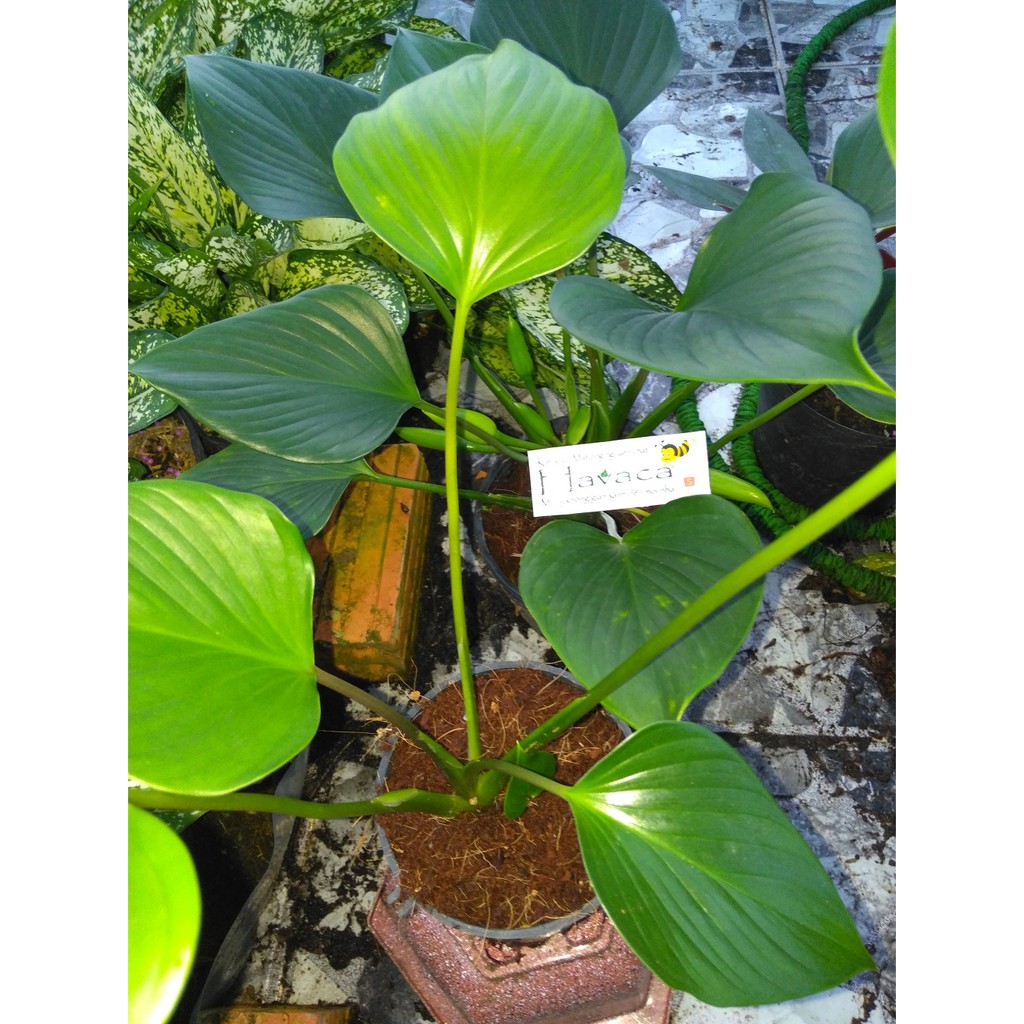 Cây có lá màu xanh đậm, lá bóng hình bầu dục, hình trái tim hoặc hình mũi mác, dài khoảng 20 cm, chiều rộng gần bằng phân nửa chiều dài. Cây có lá hình trái tim, màu sắc lá xanh tươi đến xanh đậm. Cây dễ trồng, trồng nơi có ánh sáng vừa, có gió lưu thông, tránh ánh nắng gay gắt trực tiếp.