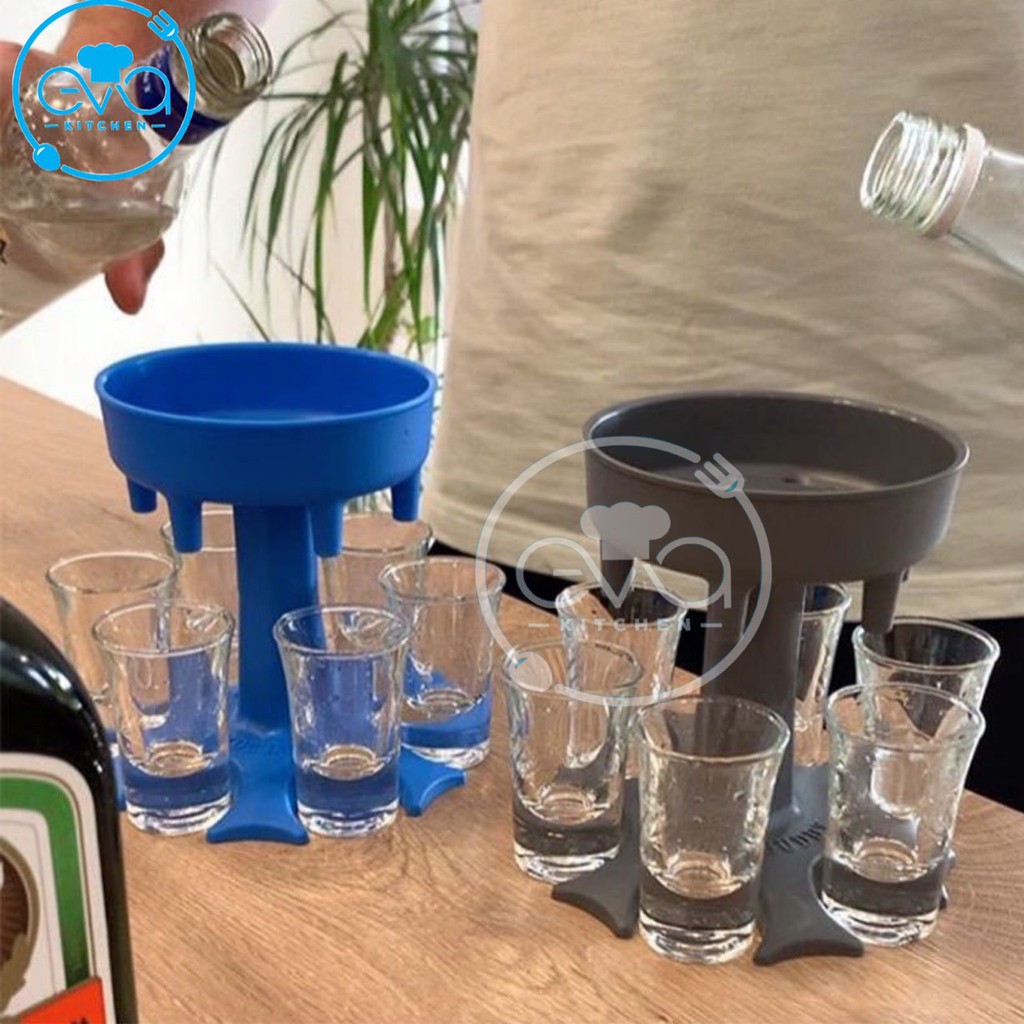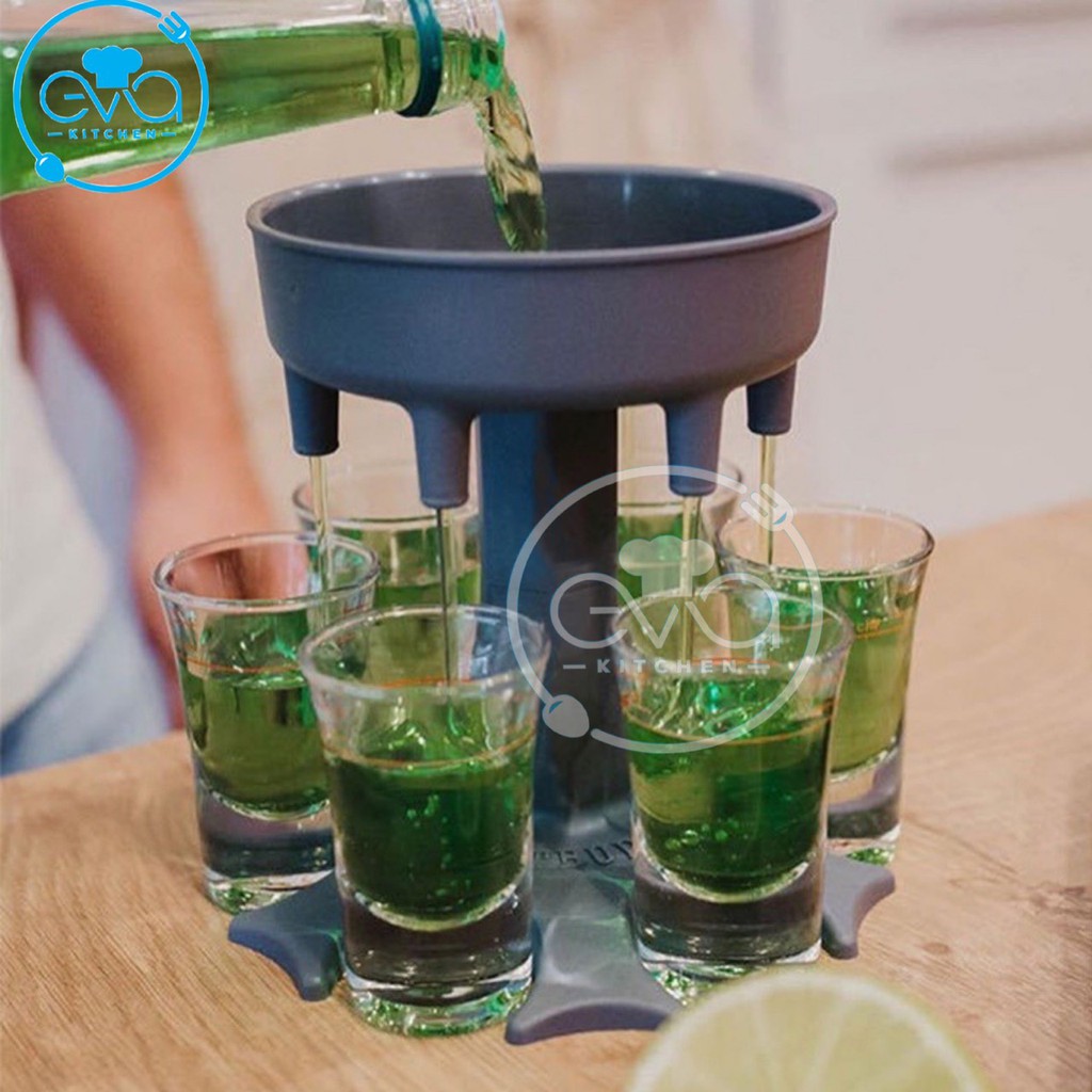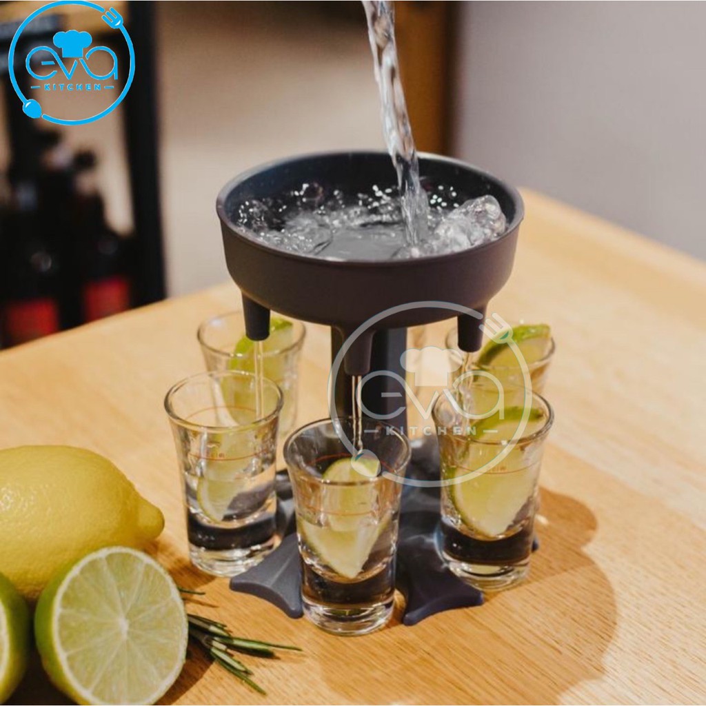 - Kiểu dáng : Dạng phễu có 6 vòi rót và 6 chân Đỡ ly , chỉ cần đổ dung dịch lên bên trên là phểu sẽ tự động chia rót xuông thành 6 vòi đều nhau , giúp nhanh chóng chia rượu đều mà chỉ cần 1 lần rót