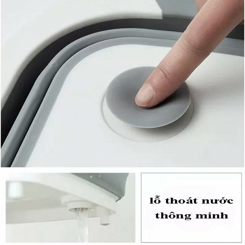 Sản phẩm thớt co giãn để trở thành chậu, rửa rau quả trực tiếp, có ke thoát nước rửa xong có thể xả nước đi luôn và làm khay chứa như rổ .