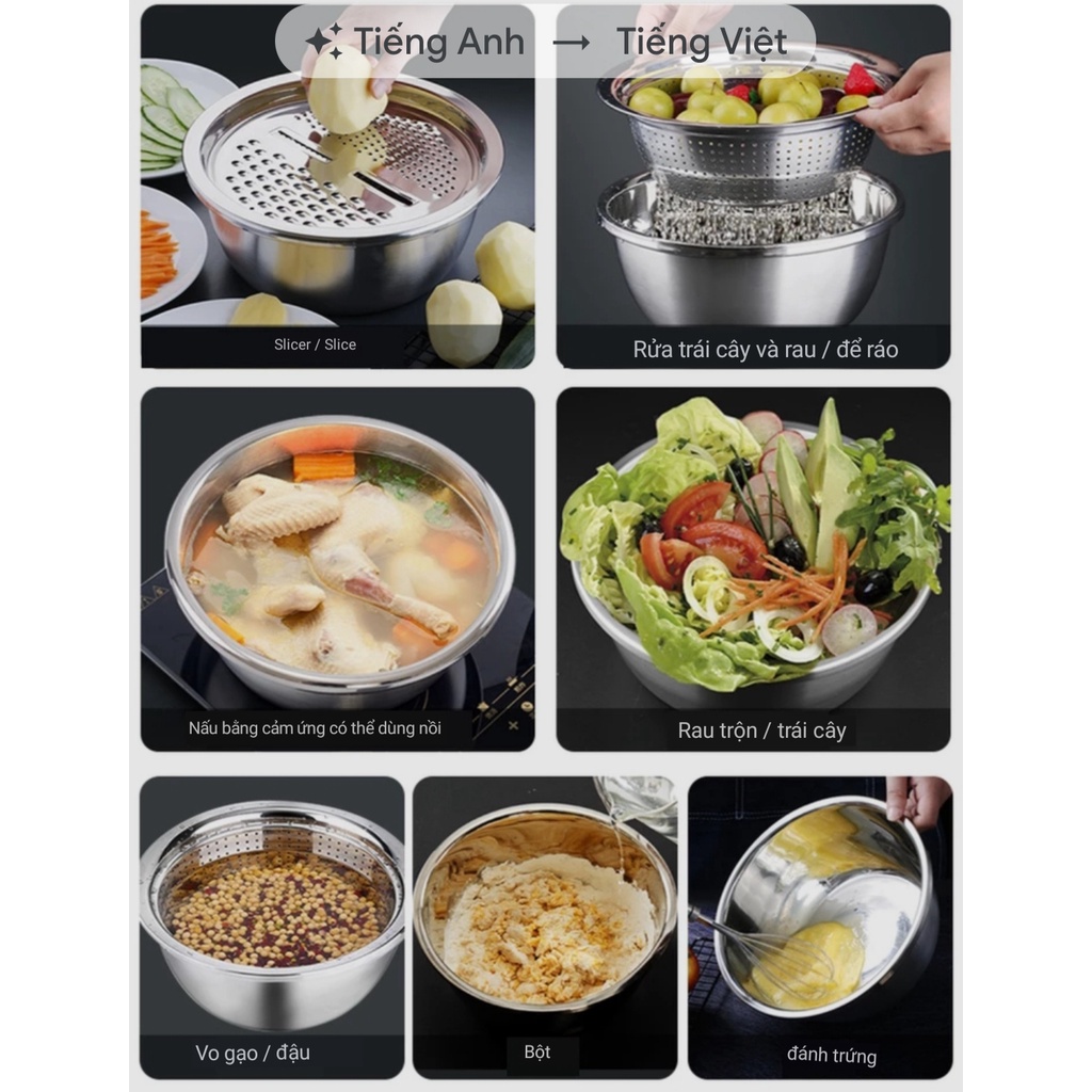 Nhà cửa & Đời sống > Dụng cụ nhà bếp > Bàn nạo, dụng cụ bào, cắt || Bộ thau rổ bào rau củ quả inox 304 không rỉ - Set 3 món thau rổ bàoCòn hàng