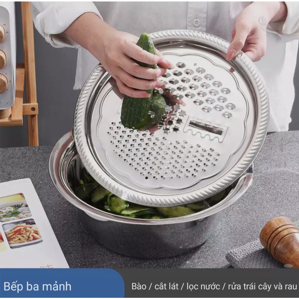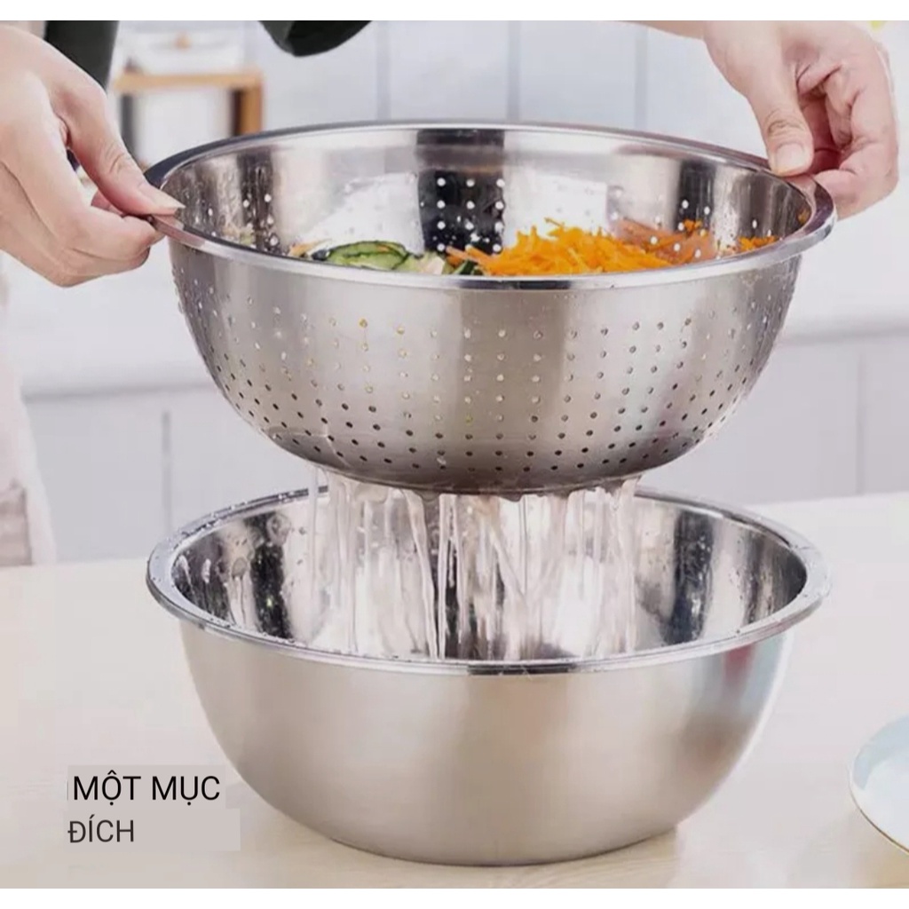 Bộ thau rổ bào rau củ quả inox 304 không rỉ - Set 3 món thau rổ bàoThấu hiểu nhu cầu của bà nội trợ trong "sứ mệnh" vô cùng thiêng liêng trong mỗi bữa ăn, chúng tôi đã nhập khẩu về bộ rổ inox đa năng, 3 chi tiết, vừa làm RỔ, vừa làm CHẬU, vừa làm MÂM NẠO, GỌT, THÁI LÁT rau, củ, quả chuyên nghiệp đa năng, làm cho món ăn vô cùng đẹp mắt đồng thời tiết kiệm diện tích bếp.