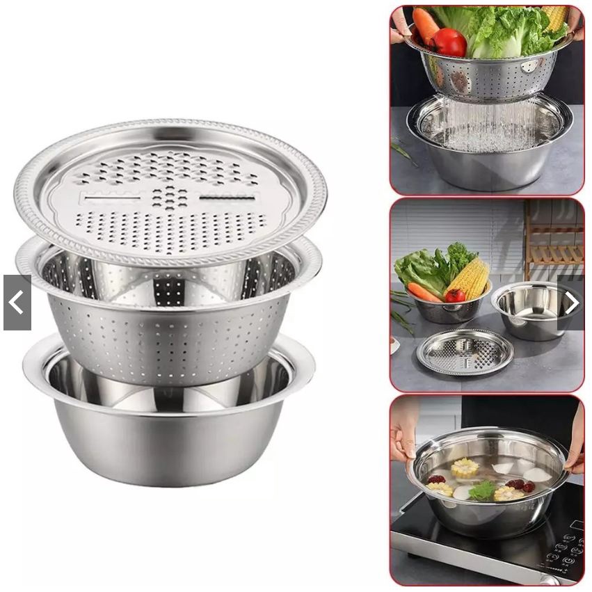 Nhà cửa & Đời sống > Dụng cụ nhà bếp > Bàn nạo, dụng cụ bào, cắt || Bộ Thau Rổ inox 3 món bào rau củ đa năng tiện lợi ( BỘ THAO RỖ 3 MÓN )Còn hàng