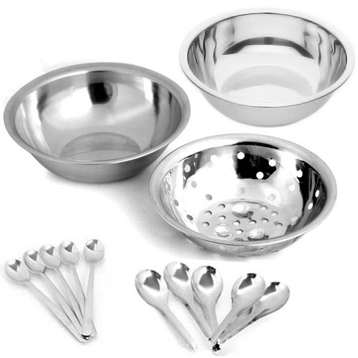 Bộ thau rổ muỗng inox 14 món cao cấpThau và rổ inox cao cấp được thiết kế đơn giản với nhiều kích thước khác nhau.