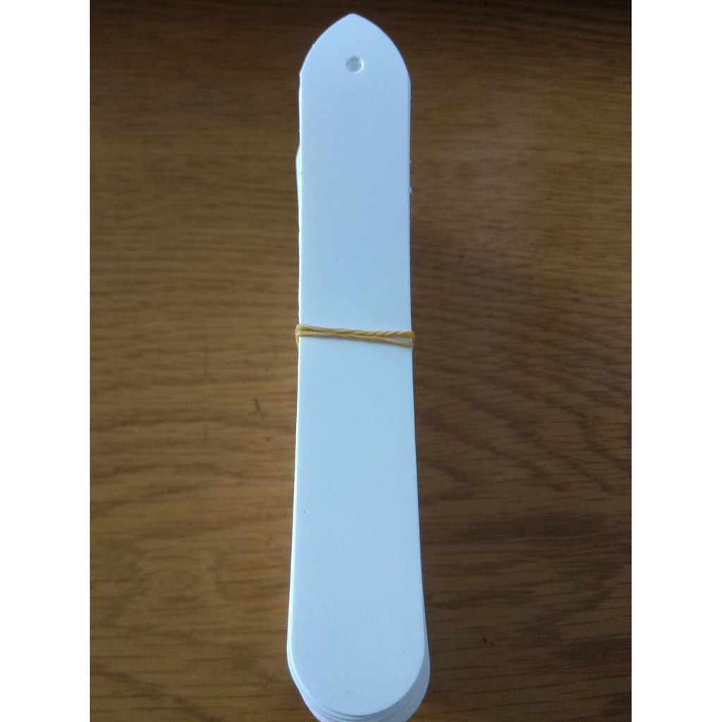 Đã đục lỗ để luồn dây treo Thẻ ghi tên cho hoa lan và cây cảnh, hoa kiểng. Để ghi chú tên giống hoa lan, ngày trồng, màu hoa… rất thích hợp cho anh em chơi lan dạng sưu tầm có bộ sưu tập giống lan lớn, nếu không ghi chú sẽ dễ nhầm lẫn khi lan chưa có hoa.. vì nhiều giống lan sẽ giống nhau.