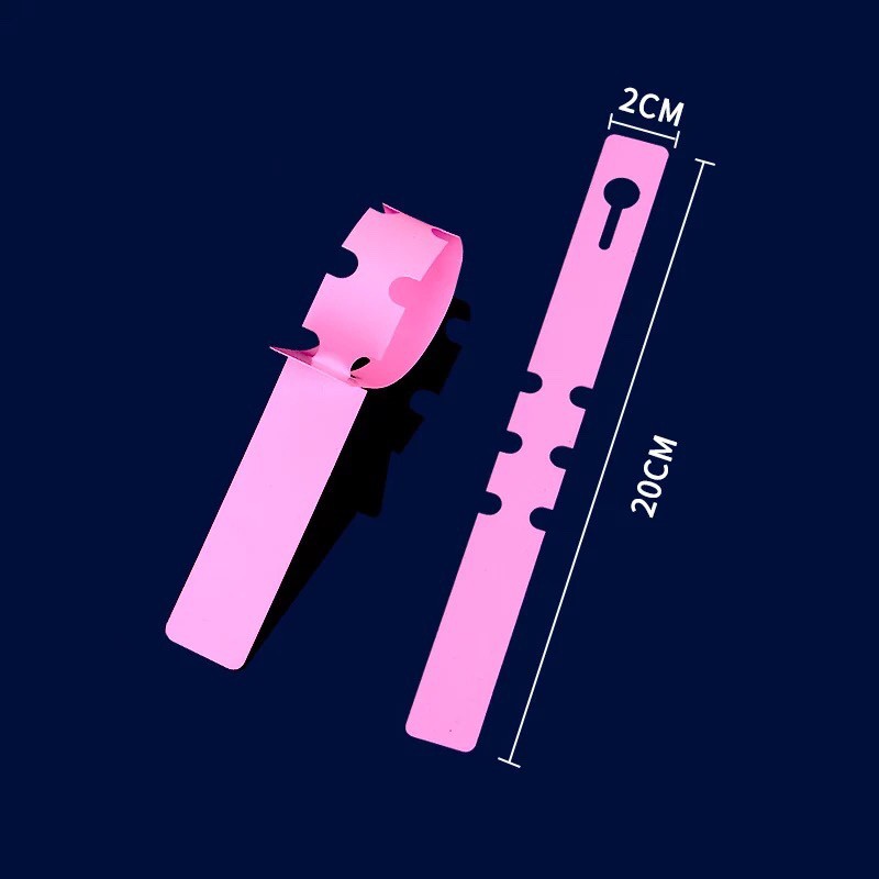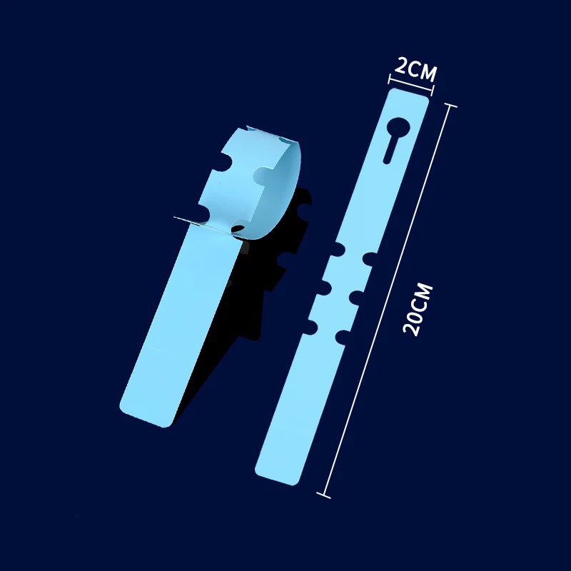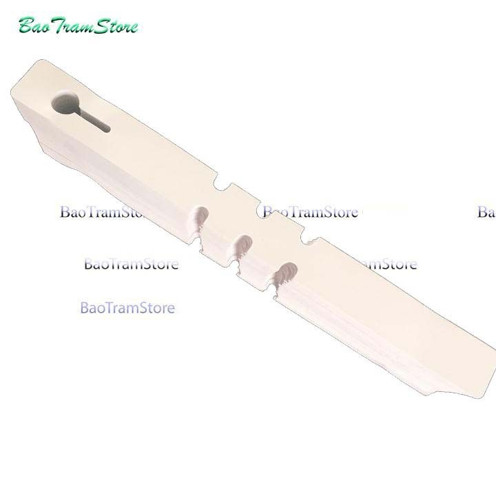 Làm bằng nhựa màu trắng, dài 11cm, rộng 2cm, một đầu đục lỗ dùng để móc treo, phần còn lại dùng để ghi chú tên.