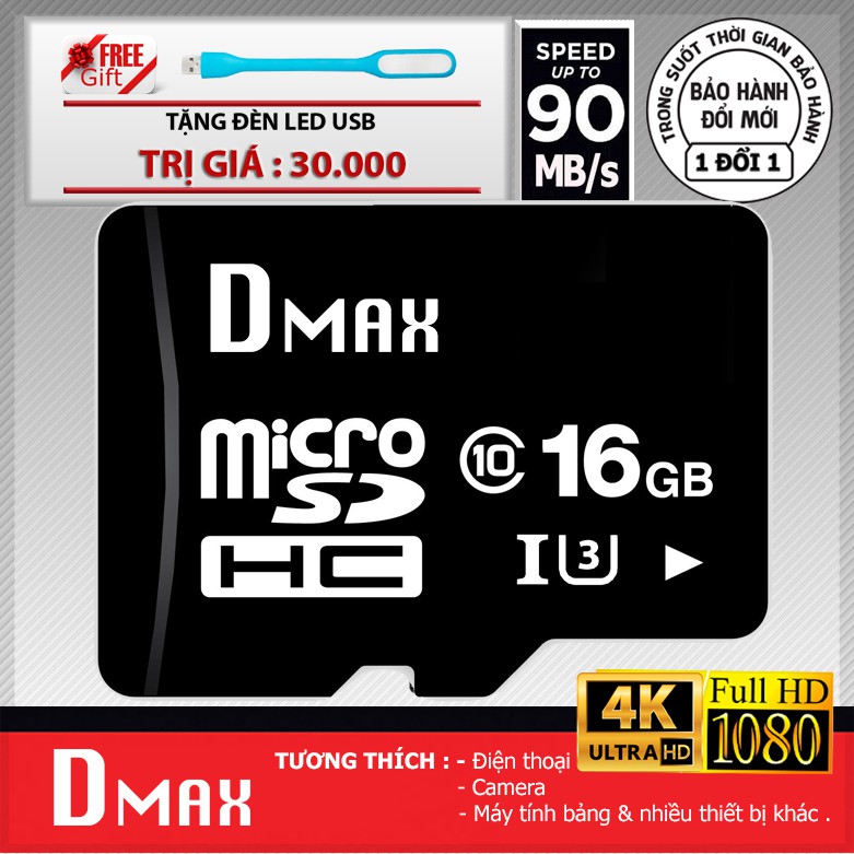 Điện Thoại & Phụ Kiện > Phụ kiện > Thẻ nhớ || Thẻ nhớ 16Gb tốc độ cao U3, up to 90MB/s Dmax Micro SDHC - Bảo hành 5 năm đổi mớiCòn hàng