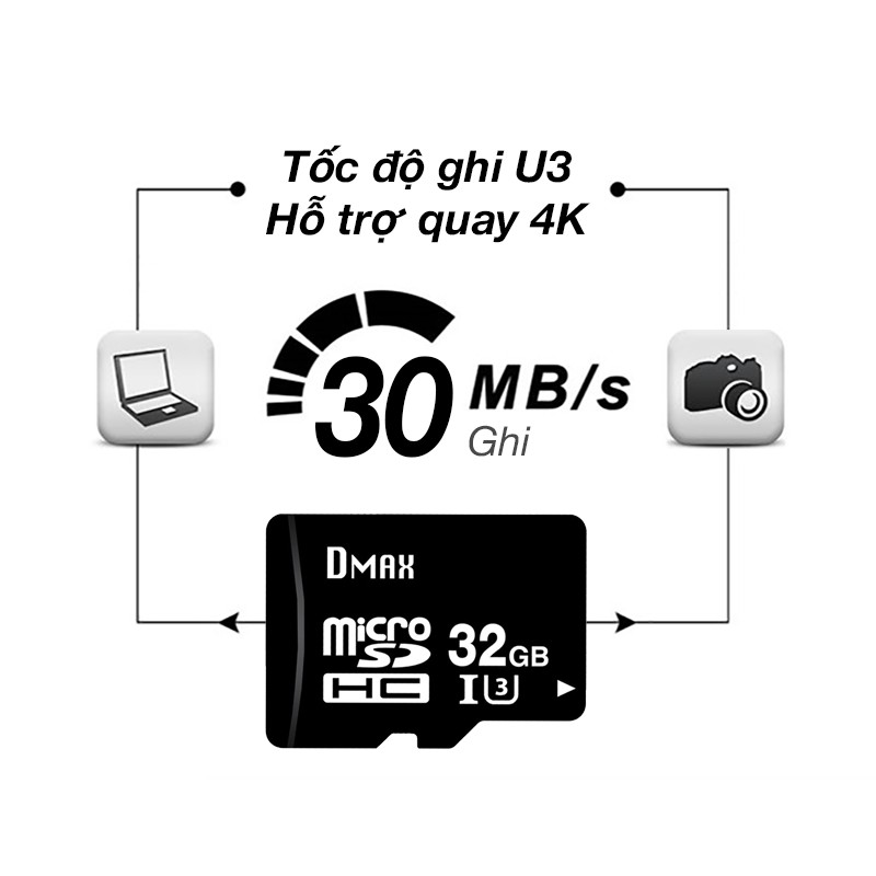 ☼ Thẻ nhớ Dmax Micro SDHC UHS1 U3, chuẩn U3 mang đến tốc độ truyền tải (đọc/ghi) dữ liệu cực nhanh phù hợp cho điện thoại, máy ảnh và các thiết bị số của bạn kể cả quay phim FullHD hay 4K.☼ Bên cạnh đó, với dung lượng lưu trữ 32Gb giúp bạn thoải mái lưu trữ mà không phải lo lắng khi lưu trữ nhiều dữ liệu công việc lẫn giải trí.