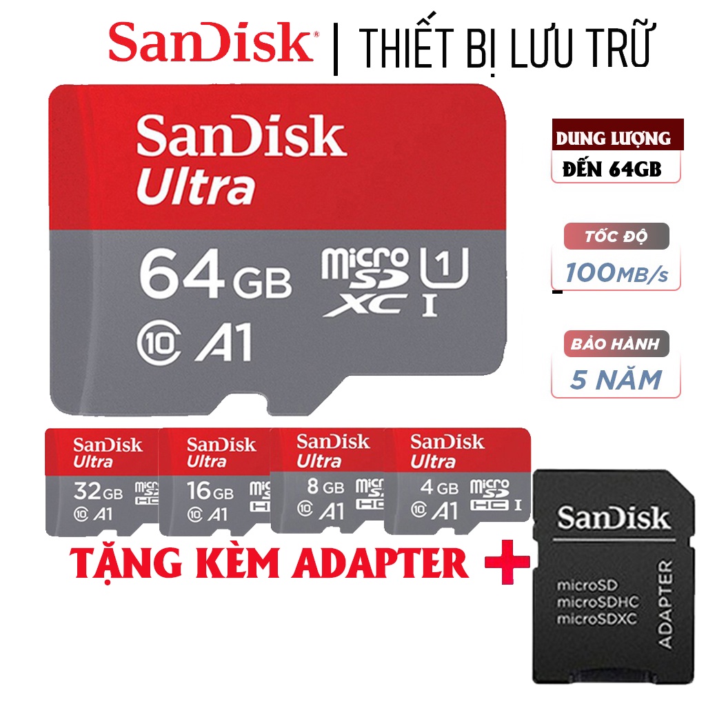 Điện Thoại & Phụ Kiện > Phụ kiện > Thẻ nhớ || Thẻ nhớ 64GB 32GB 16GB 8GB Thẻ nhớ SanDisk Ultra Class 10 667x 100MB/s chuyên dụng camera điện thoại, loa đài-BH 5 nămCòn hàng