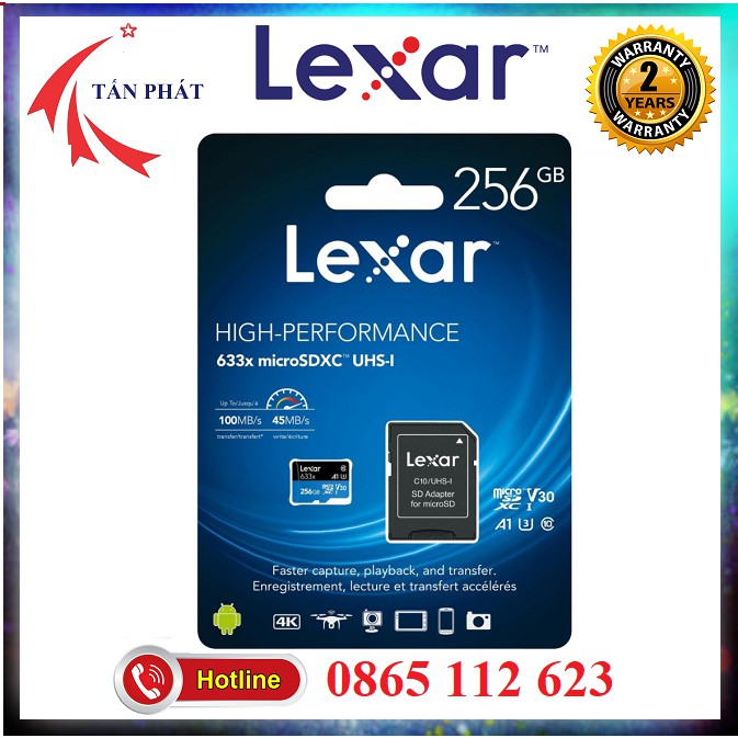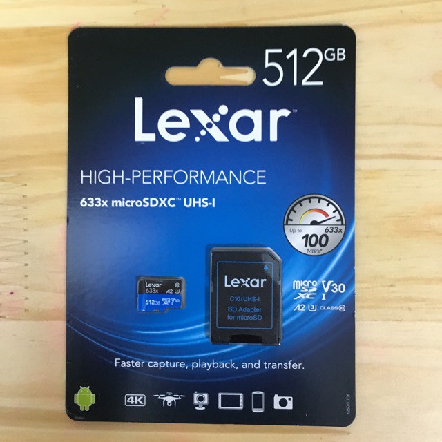 - Tên sản phẩm: Thẻ nhớ Lexar 512Gb / 256Gb / 128Gb 633x MicroSDHC UHS-I Class 10 A1 U3 100MB/s + Adapter