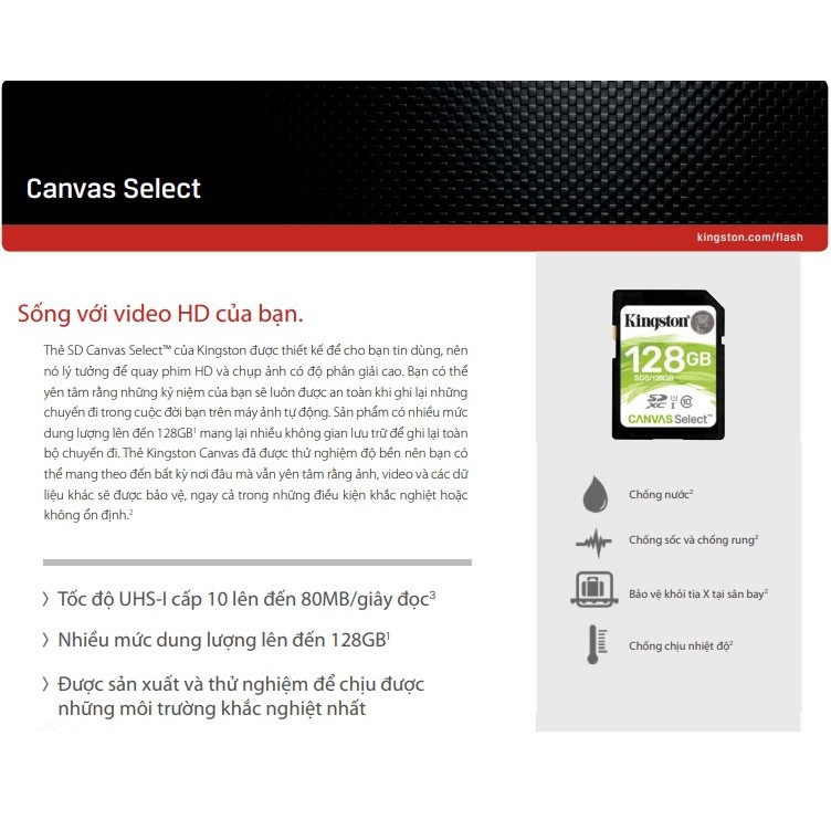 Thẻ SD Canvas Select của Kingston được thiết kế để cho bạn tin dùng, vì thế nó lý tưởng để quay phim HD và chụp ảnh có độ phân giải cao trên máy ảnh tự động của bạn. Thẻ đã được thử nghiệm độ bền1, nên bạn có thể mang theo đến bất kỳ đâu mà vẫn yên tâm rằng ảnh, video và các dữ liệu khác sẽ được bảo vệ. Sản phẩm có nhiều mức dung lượng lên đến 128GB2, mang lại nhiều không gian lưu trữ để ghi lại những chuyến đi trong cuộc đời.