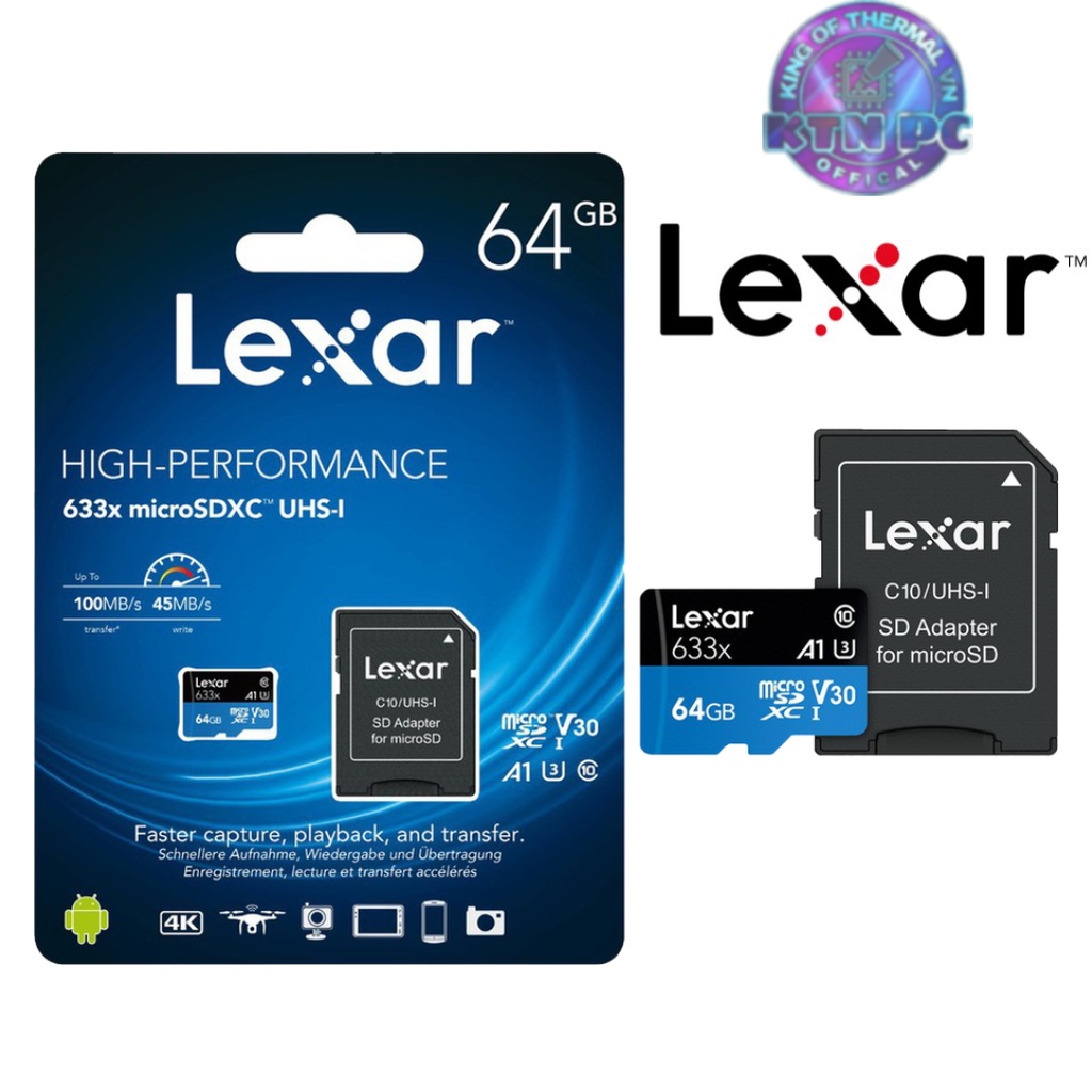 Thẻ nhớ Micro SD lexar 64GB UHS-I SDXC 633x U3 100Mb/sLoại card: Thẻ TF Micro