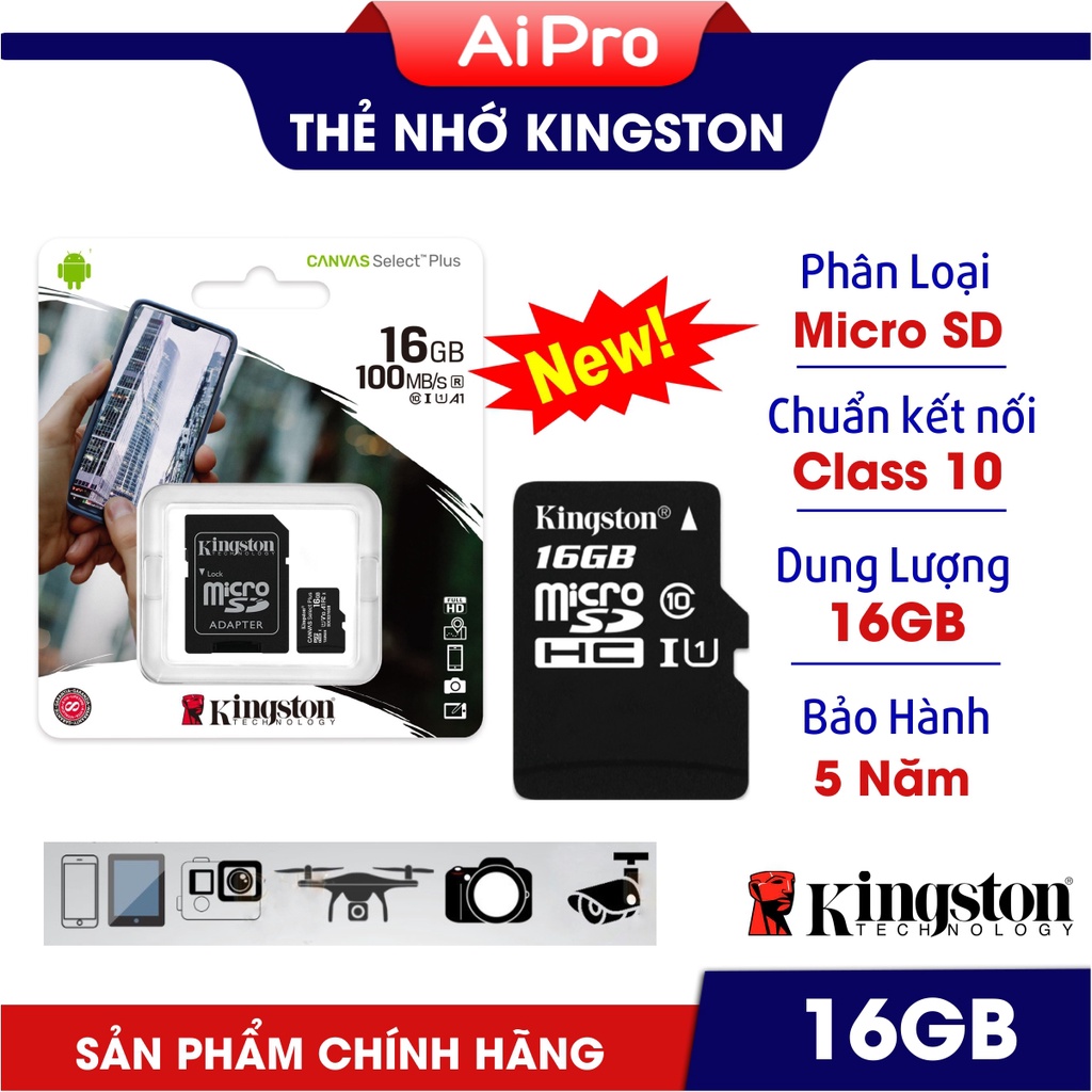 Thẻ Nhớ MicroSD Kingston 16GB - Thiết kế mới - Tăng tốc độ đọc ghi - Hàng nhập khẩu - Bảo Hành 5 nămTHÔNG TIN SẢN PHẨM: