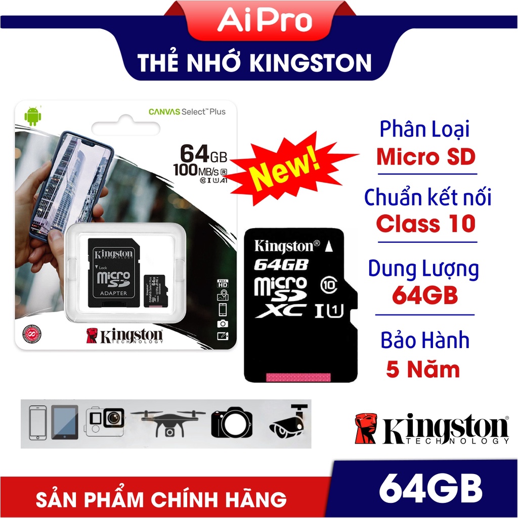 Điện Thoại & Phụ Kiện > Phụ kiện > Thẻ nhớ || Thẻ Nhớ MicroSD Kingston 64GB - Thiết kế mới - Tăng tốc độ đọc ghi - Hàng nhập khẩu - Bảo Hành 5 nămCòn hàng