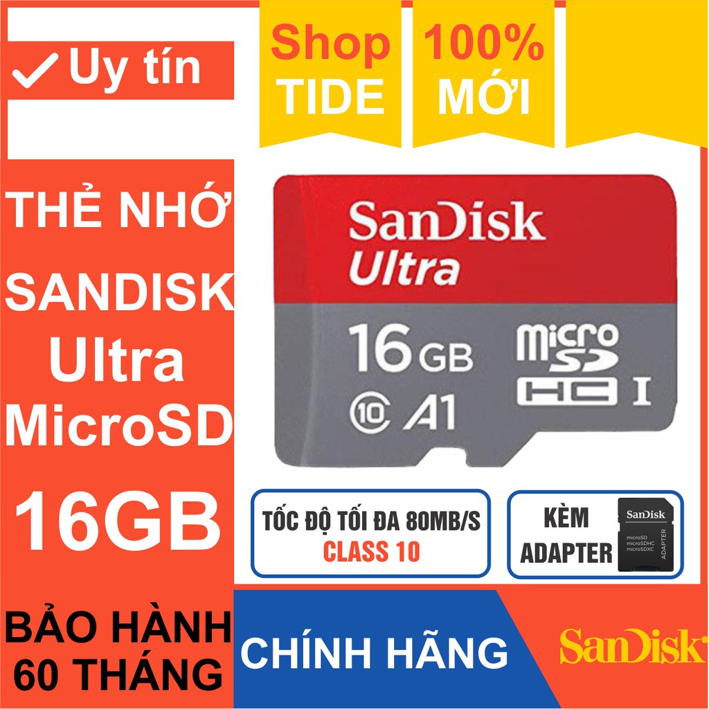 Điện Thoại & Phụ Kiện > Phụ kiện > Thẻ nhớ || Thẻ nhớ MicroSD SanDisk 16GB – Bảo hành 5 năm – CHÍNH HÃNG – Kèm AdapterCòn hàng