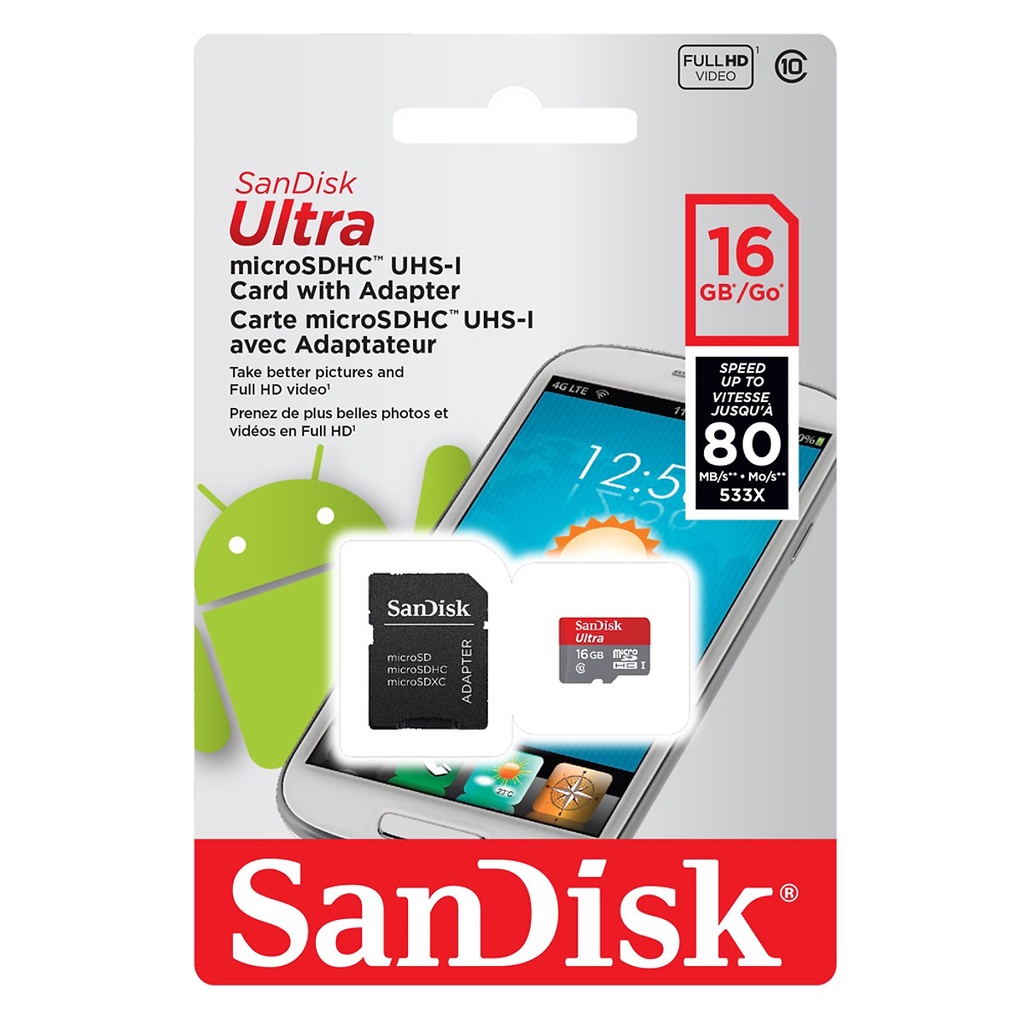 Giới thiệu Thẻ nhớ MicroSD SanDisk Ultra 16GB dùng cho máy ảnh, điện thoại - tốc độ 80MB/s - BH 5 năm