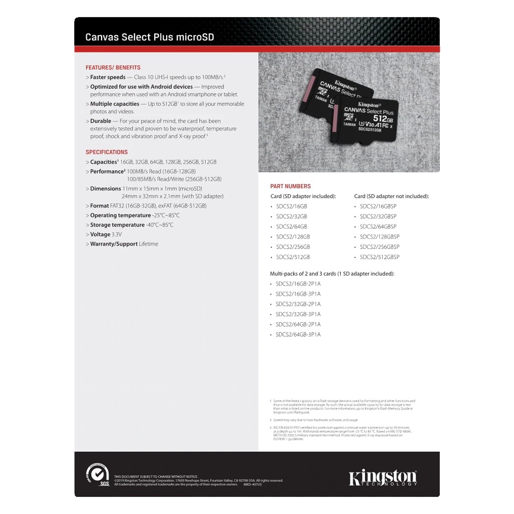 Để đáp ứng nhu cầu cụ thể của bạn, thẻ nhớ Kingston MicroSD Canvas Select Class 10 UHS-I có dung lượng từ 16GB đến 256GB.