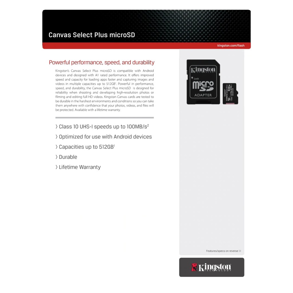 Thẻ nhớ Kingston MicroSD Canvas Select Plus với chuẩn tốc độ A1, thích hợp cho các nhiếp ảnh gia và người dùng có nhu cầu chụp ảnh động và quay phim FullHD chất lượng cao, là lựa chọn bộ nhớ lưu trữ mở rộng tiêu chuẩn cho tất cả các loại máy tính bảng, điện thoại thông minh và máy quay hành trình.