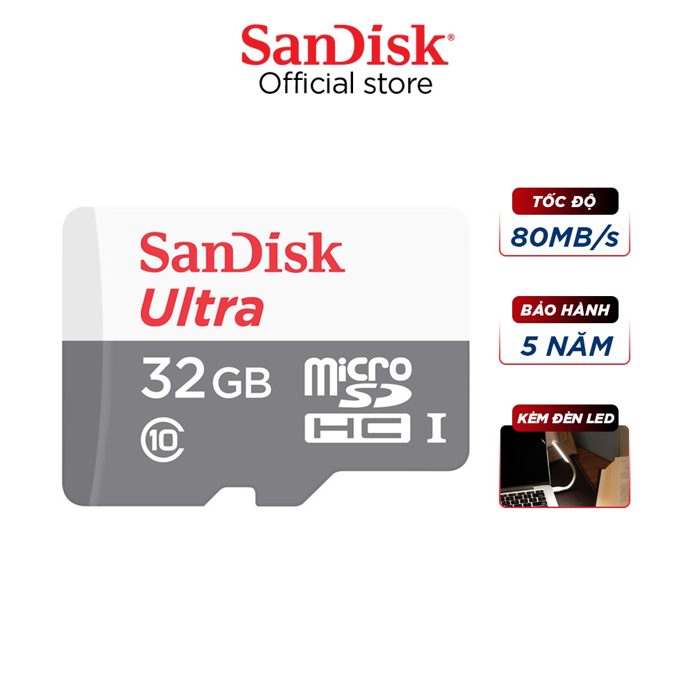 Thẻ nhớ microSDHC Sandisk 32GB upto 80MB/s 533X Ultra UHS-I tặng đèn LED USB