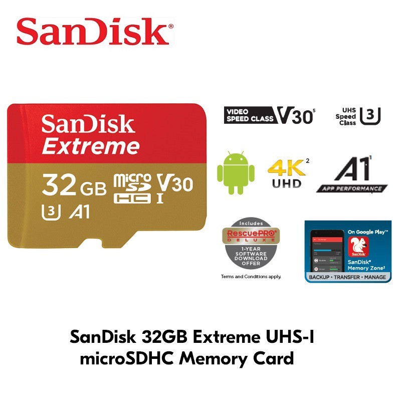 Thẻ nhớ MicroSDHC SanDisk Extreme V30 A1 667x với tốc độ ghi cực nhanh cho phép chụp hình và quay Video Full HD, 4k dành cho điện thoại thông minh Android, máy ảnh MIL, hoặc GoPro Hero3, Hero3 +, Hero4, và Hero +. Thẻ nhớMicroSDHC SanDisk Extreme V30 A1 667x được thiết kế đặc biệt có thể tồn tại ngay cả trong điều kiện môi trường khắc nghiệt nhứt. Tốc độ nhanh cho phép bạn chụp rõ từng chi tiết và giúp di chuyển dữ liệu cực nhanh. Với dung lượng lên đến 32GB giúp mở rộng bộ nhớ điện thoại của bạn và hỗ trợ quay phim 4K chất lượng cao. Tất cả các sản phẩm SanDisk được sản xuất với tiêu chuẩn cao nhứt và đã được thử nghiệm chặt chẽ, vì vậy bạn có thể tự tin vào chất lượng vượt trội, hiệu suất và độ tin cậy của mỗi sản phẩm SanDisk.