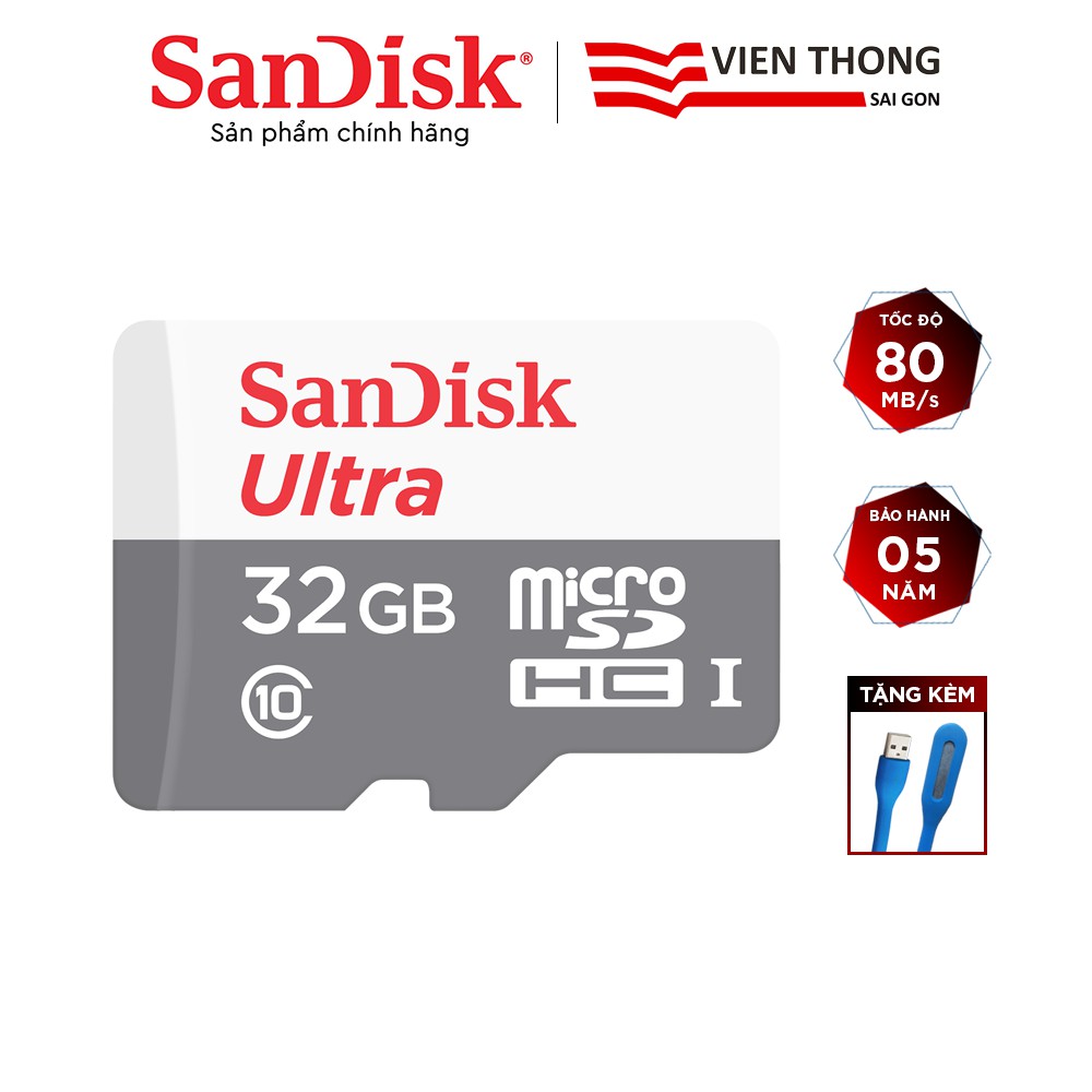 Giới thiệu Thẻ nhớ microSDHC SanDisk Ultra 32GB upto 80MB/S 533x tặng đèn LED USB