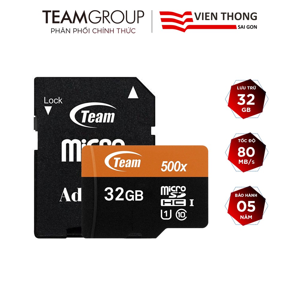 Thẻ nhớ microSDHC Team 32GB 500x upto 80MB/s class 10 U1 kèm Adapter (Cam) - Hãng phân phối chính thức