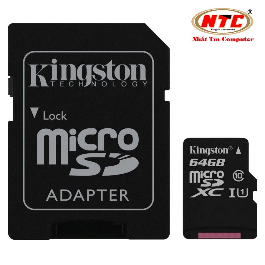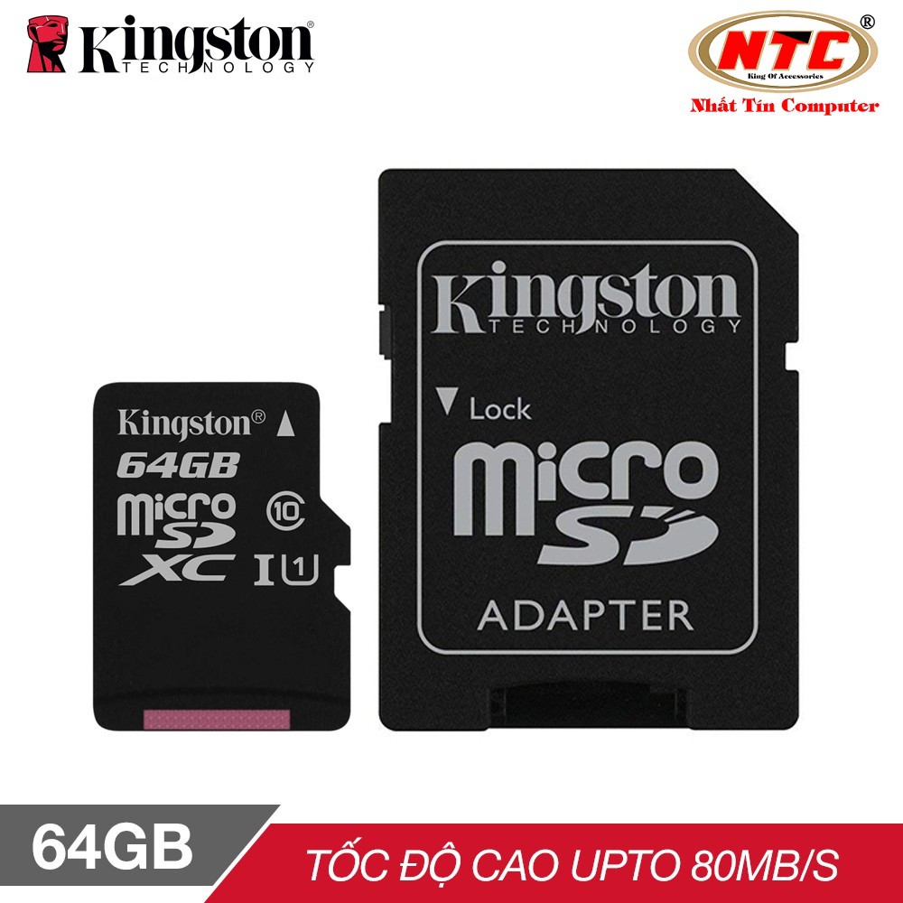 Thẻ nhớ microSDXC Kingston 64GB Class 10 U1 80MB/s kèm adapter (Đen) - Kèm Adapter - Hàng chính hãngThẻ nhớ Kingston MicroSDHC/SDXC Class10 UHS-1 U1 của Kingston giúp tăng dung lượng lưu trữ trên điện thoại di động, smartphone, máy tính bảng và các thiết bị di động khác. Được trang bị công nghệ DHC, thẻ có khả năng tính toán tốc độ đọc ghi phù hợp một cách nhanh chóng. Hơn thế nữa, thẻ tương thích với nhiều thiết bị số khác nhau, cho bạn dễ dàng lưu trữ và truy xuất dữ liệu.Thẻ nhớ Kingston Micro SDHC Class10 UHS-1 sẽ là phụ kiện không thể thiếu của bạn dành cho các thiết bị thông minh của mình.Hãy chọn ngay thẻ nhớ Kingston MicroSDHC/SDXC Class10 UHS-1 làm người bạn đồng hành tốt nhất cho điện thoại thông minh của bạn...