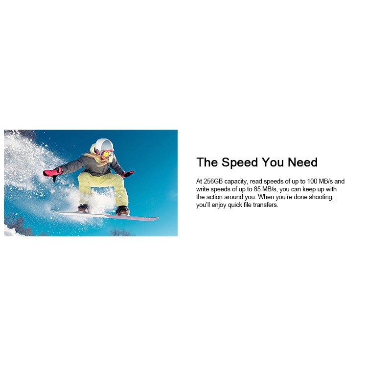 Với dung lượng 256GB, tốc độ đọc lên đến 100 MB/s và tốc độ ghi lên đến 85 MB/s , bạn có thể theo kịp hành động xung quanh mình. Khi bạn chụp xong, bạn sẽ được truyền tệp nhanh chóng.