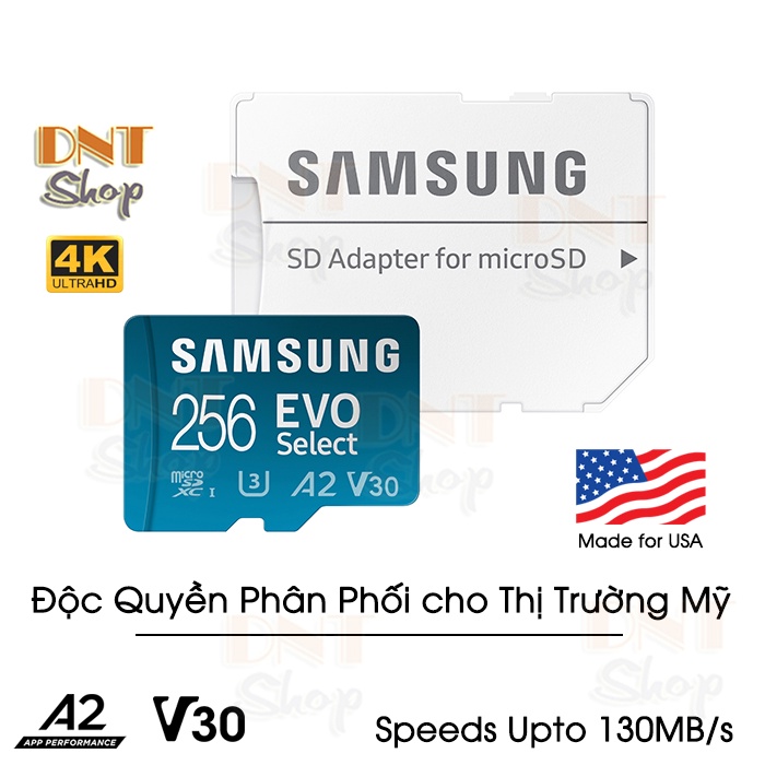Thẻ nhớ MicroSDXC Samsung EVO Select 256GB U3 4K V30 A2 130MB/s - Độc quyền xuất thị trường Mỹ - Made For US