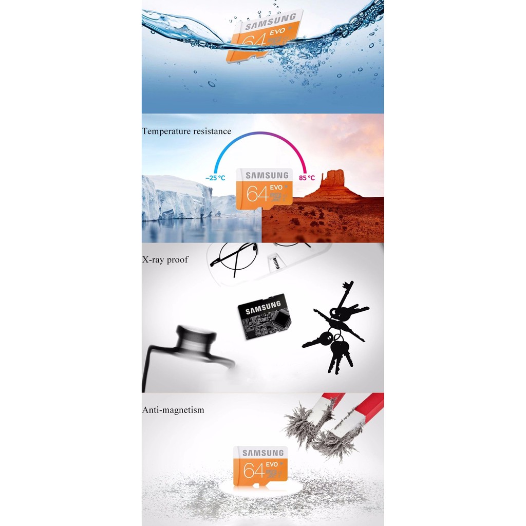 - Thẻ còn có chức năng chống thấm nước, chịu được chêch lệch nhiệt độ cao, không bị ảnh hưởng bởi từ tính và tia X, do đó, dữ liệu của bạn sẽ luôn được bảo vệ an toàn trong mọi trường hợp. Sản phẩm đi kèm 1 adapter microSD to SD để bạn sử dụng được trên máy ảnh kĩ thuật số, laptop, desktop.