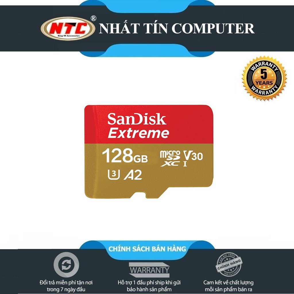 Thẻ Nhớ MicroSDXC SanDisk Extreme 128GB V30 U3 4K A2 R160MB/s W90MB/s (Vàng) - No AdapterThẻ nhớ với tốc độ ghi cực nhanh cho phép chụp hình và quay Video Full HD, 4k dành cho điện thoại thông minh Android, máy ảnh MIL, hoặc GoPro Hero3, Hero3 +, Hero4, và Hero +. Thẻ nhớMicroSDSanDisk Extreme V30 A2 được thiết kế đặc biệt có thể tồn tại ngay cả trong điều kiện môi trường khắc nghiệt nhứt. Tốc độ nhanh cho phép bạn chụp rõ từng chi tiết và giúp di chuyển dữ liệu cực nhanh. Với dung lượng lên đến 128GB giúp mở rộng bộ nhớ điện thoại của bạn và hỗ trợ quay phim 4K chất lượng cao.
