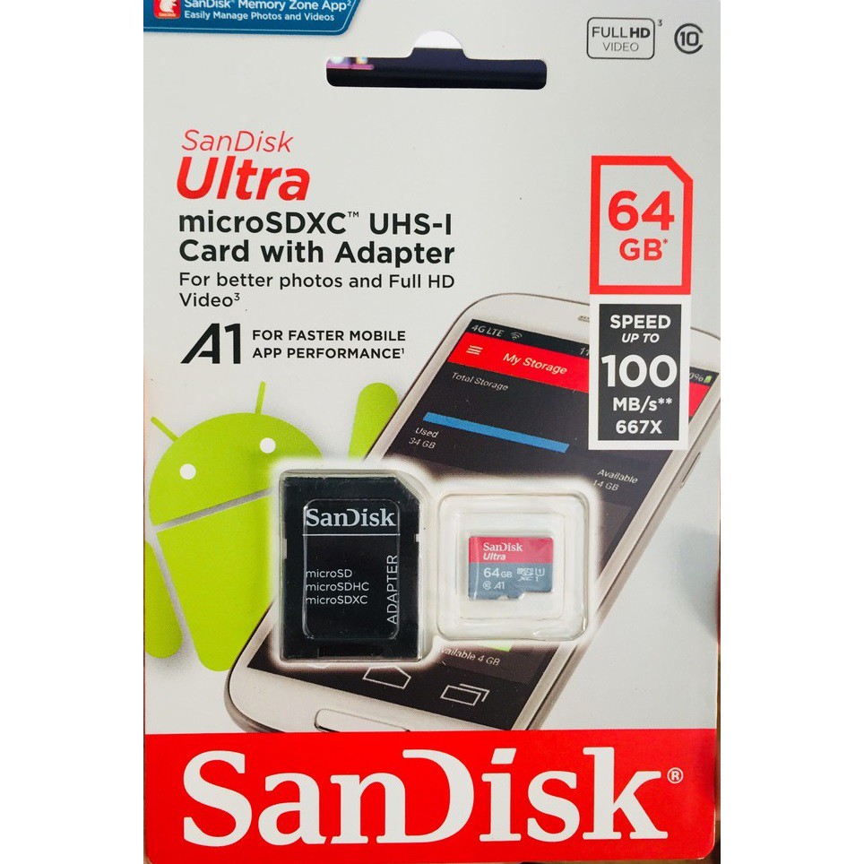 Điện Thoại & Phụ Kiện > Phụ kiện > Thẻ nhớ || Thẻ nhớ MicroSDXC SanDisk Ultra A1 64GB Class 10 U1 100MB/s - kèm adapter (Đỏ)Còn hàng