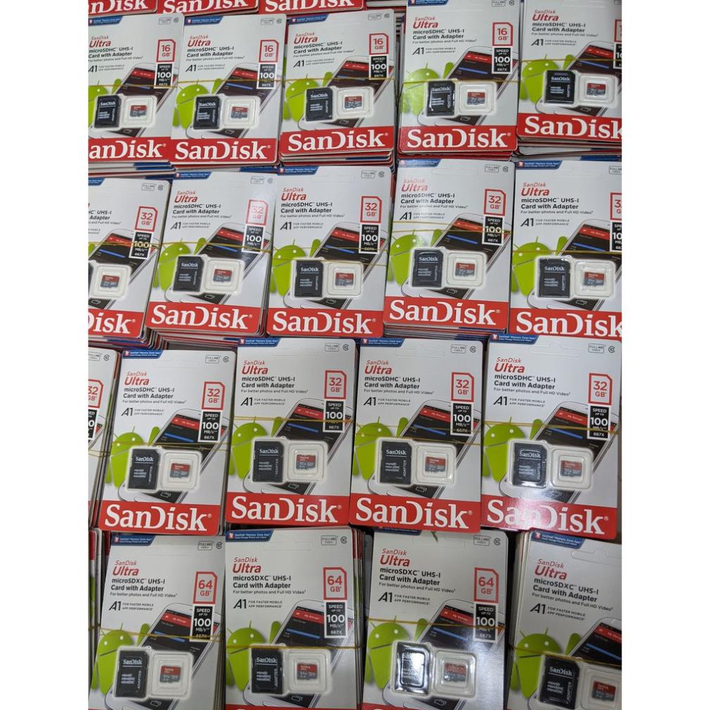 Thẻ nhớ sandisk 64GB /32Gb/16GB/8GB dùng điện thoại, máy ảnh - Thẻ nhớ tốc độ cao Class 10 Ultra 667x 100MB/s -BH 5 nămLưu ý : Sản phẩm có thể rọc box để dán tem bảo hành lên thẻ, các thẻ nhớ được bảo hành 12 tháng dựa vào tem bảo hành trên thẻ. Sản phẩm có kèm hộp nhựa. Thẻ nhớ được dùng kèm với Adapter SD cho những tác vụ lưu trữ trên máy ảnh chuyên nghiệp hoặc Laptop PC thiết bị có hỗ trợ cổng SD. Nếu chỉ dùng cho điện thoại, camera ip hoặc máy nghe nhạc...thì không cần kèm Adapter SD.