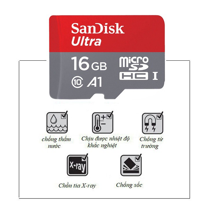 - Thẻ nhớ MicroSD Sandisk Ultra với tốc độ cao, cho phép bạn chụp ảnh chất lượng cao và quay video Full HD rất mượt mà