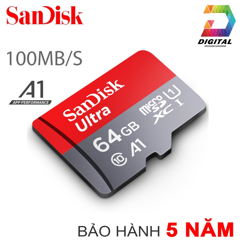 Thẻ Nhớ SanDisk 64GB Ultra 100MB/s MicroSDXC UHS-I A1 Chính HãngThẻ nhớ MicroSD SanDisk Ultra A1 cho phép bạn lưu giữ, truyền tải hình ảnh có độ phân giải cao và video Full HD trên điện thoại thông minh Android hoặc máy tính bảng của bạn. Với dung lượng lên đến 64GB, thẻ nhớ MicroSD SanDisk Ultra A1 có thẻ lưu trữ rất nhiều album hình ảnh độ phân giải cao và quay video Full HD. Với tốc độ chuẩn Class 10 để quay video Full HD và tốc độ đọc lên đến 100MB/s để chuyển file cực nhanh. Thẻ nhớ MicroSD SanDisk Ultra A1 không thấm nước, chống thấm, chống nhiệt, chống sốc, chống tia x-ray, và chống từ trường.