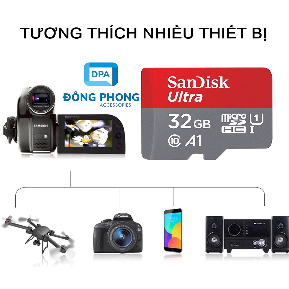 Thẻ nhớ MicroSD SanDisk Ultra A1 tương thích hoàn hảo với điện thoại thông minh, máy tính bảng, camera,.... ngoài ra thẻ này cũng tương thích tuyệt đối với các dòng máy ảnh dùng thẻ nhớ nhỏ.