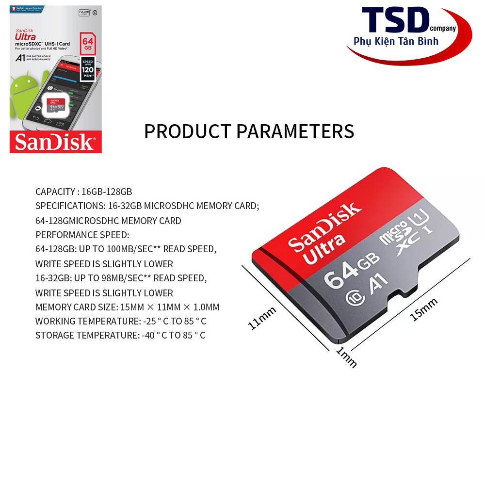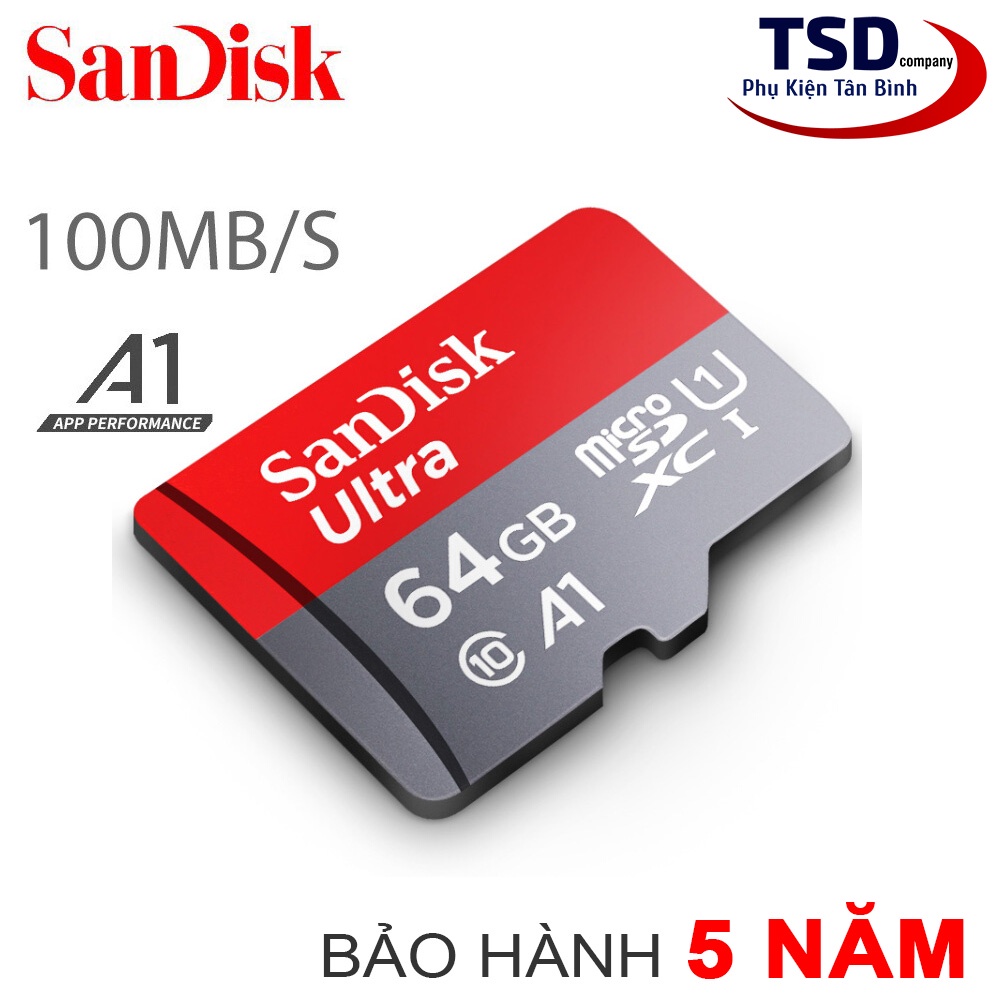 Thẻ Nhớ SanDisk Ultra 64GB 100MB/s MicroSDXC UHS-I A1 Chính HãngThẻ nhớ MicroSD SanDisk Ultra A1 cho phép bạn lưu giữ, truyền tải hình ảnh có độ phân giải cao và video Full HD trên điện thoại thông minh Android hoặc máy tính bảng của bạn. Với dung lượng lên đến 64GB, thẻ nhớ MicroSD SanDisk Ultra A1 có thẻ lưu trữ rất nhiều album hình ảnh độ phân giải cao và quay video Full HD. Với tốc độ chuẩn Class 10 để quay video Full HD và tốc độ đọc lên đến 100MB/s để chuyển file cực nhanh. Thẻ nhớ MicroSD SanDisk Ultra A1 không thấm nước, chống thấm, chống nhiệt, chống sốc, chống tia x-ray, và chống từ trường.