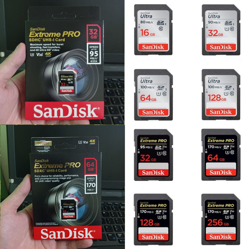 Điện Thoại & Phụ Kiện > Phụ kiện > Thẻ nhớ || Thẻ nhớ SD Sandisk 32G 64G Ultra Class 10 và Extreme Pro tốc độ cao 4K cho máy ảnh máy quayCòn hàng