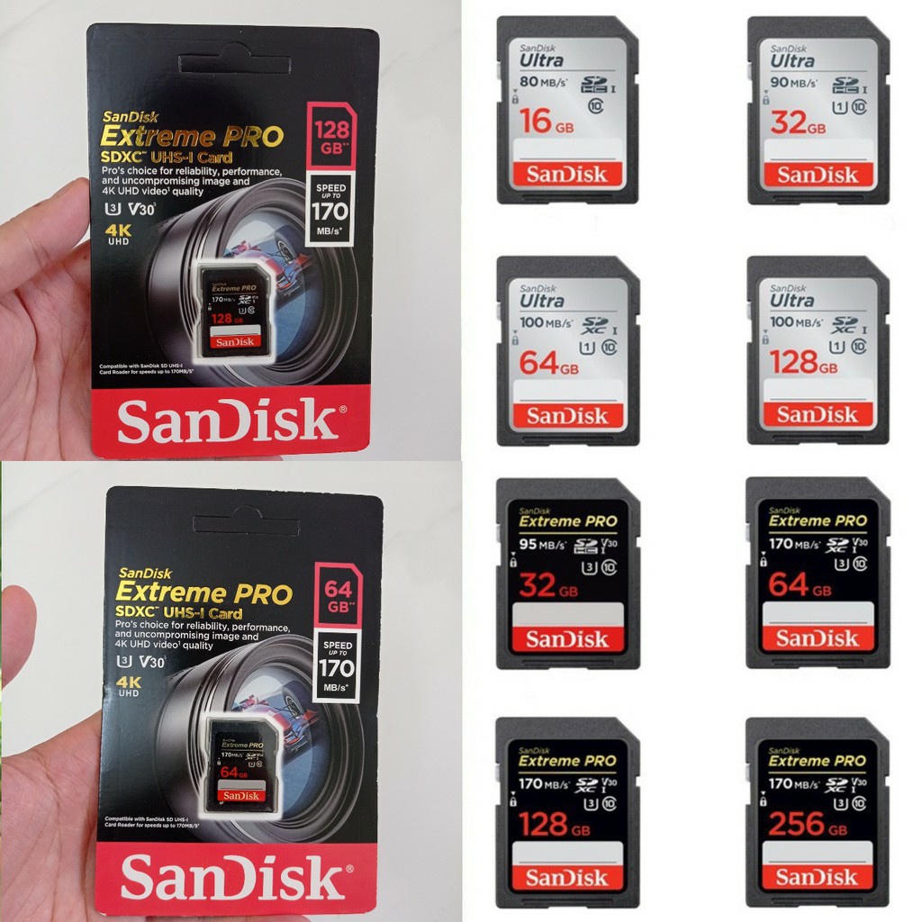 Điện Thoại & Phụ Kiện > Phụ kiện > Thẻ nhớ || Thẻ nhớ SD Sandisk 32G 64G Ultra Class 10 và Extreme Pro tốc độ cao 4K cho máy ảnh máy quayCòn hàng